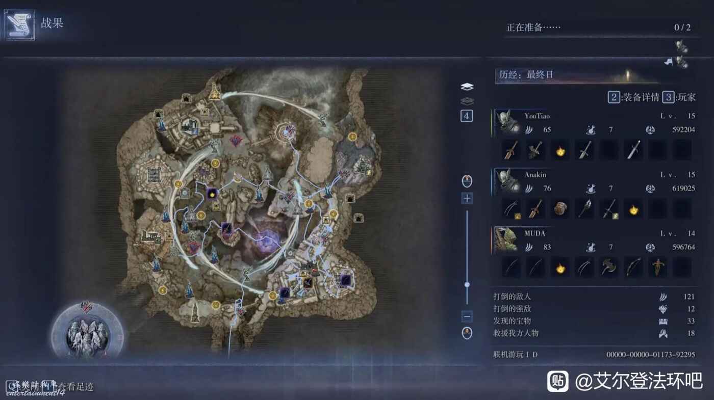 落地照樣先升2,右上角落地打完靈廟剛好五級,左下角落地傭兵集團打完也是五級。然後直接打左上角或者右下角的主城,雖然有半血buff 但是裡面怪的強度不是太高,當深夜45打就行了,除了中間黃金樹能全清,清完十一級。