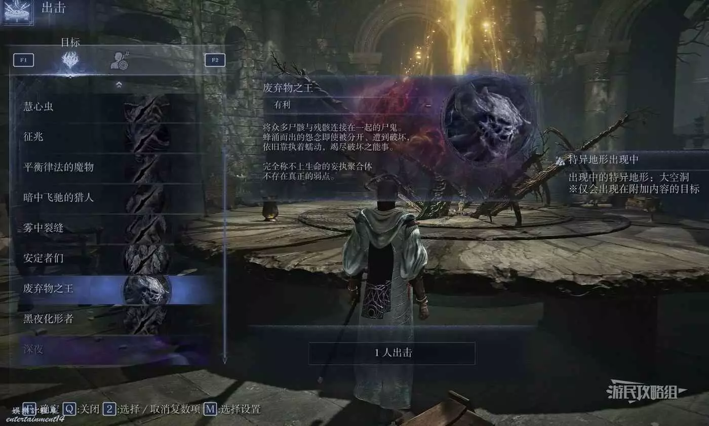 出擊介面沒有弱點標記,但實測凍傷有效。將第一階段血條削減為0時,會進入第二階段(出現第二個血條),具有多種會累積腐敗的攻擊手段和連招。出擊並擊敗第三天的BOSS廢棄物之王可獲得獨特遺物【廢棄物之夜】。
