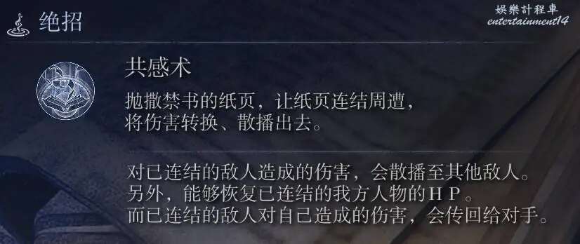 持續20s,對敵人造成的直接傷害會傳遞20%到其他敵方目標上,玩家攻擊會吸取傷害量的30%並傳遞給其他隊友,受到敵方攻擊後會向傷害來源回彈25%的傷害(不存在傷害減免)