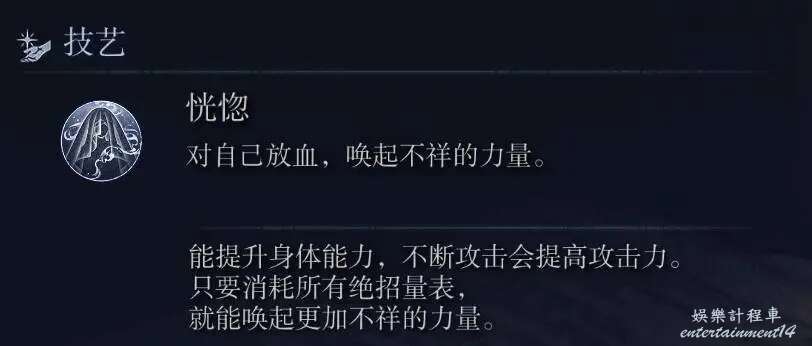 “不斷攻擊會提高攻擊力”:在恍惚模式進行一定次數的攻擊可以在技藝剩餘時間內再提高10%的攻擊,能看到一個白光吸到玩家身上。與連擊值無關,法術禱告均可觸發。匕首等輕武器約需5下,小錘4下,戟3下,特大2下。