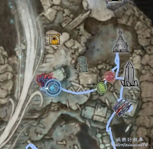 左下角,落地常規升級後去第一個紅點看有沒有水晶,接著往第一個教堂去,一般都是外面藍點一個boss,內部藍點一個boss打完就走,地下墓地的不打,浪費時間。