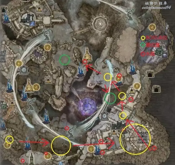 先說結論:第一天應該以藍球和等級為主,也就是說應該主刷地圖下方墓地和地圖右下的地下這兩個主資源點,滿地圖找水晶是非常低效的。為什麼這麼說呢,來算一筆帳就明白了。首先,出生點在下方的兩個位置離墓地非常近,就近升二後直接去,下方有兩種情況:一神鳥一胖一瘦法師一小死鳥,或是一喚靈兩薩米爾一弱化版靈火龍,都是一腳就能踢死的白名,總共3藍球一紫球外加複製武器,路上就有兩水晶點位,這還沒算上墓地稍微往北一點的靈魂鷹處的BOSS和水晶點位。野排打完這些之後一般剛好開始第一次縮圈,如果圈縮在右下(體感絕大多數情況都是縮在右下),就直接去右下角地下開刷,右下角有多富呢,大家單人跑一遍就知道了,總共5藍球1紫球3水晶點位,更關鍵的是都是老獅子和守墓鬥士這種一腳踢死的怪,打起來非常快,而且因為資源集中,甚至能在第二次縮圈前打完。這還沒算完,打完最深處的弱化版祖靈或雙熔爐之後坐靈魂鷹,終點就是一BOSS點位,這時候一般8級了,紅名也能幹死。然後縮圈一般在地圖中部往上一點,順路你還能打兩BOSS外加三水晶點位。也就是說,如上縮圈的情況你能獲得約10籃球3紫球外加探明9水晶點位元,等級10級以上。如果是出生在右上,刷完前期的兩BOSS按照上述路線逆走即可,有靈魂鷹可以直接去地下,或者直接跑也沒多遠。下圖給了路線參考。