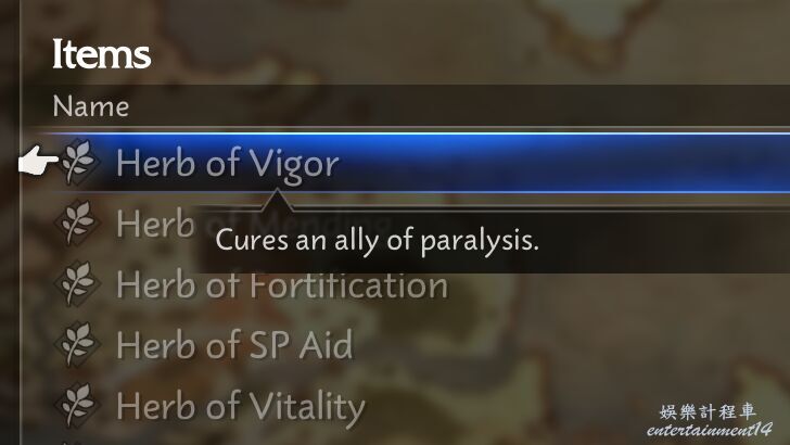 活力藥草:攜帶活力藥草,可在隊員被麻痹後立即解除狀態。建議讓非藥師角色攜帶,以便在藥師被麻痹或行動未就緒時應急。