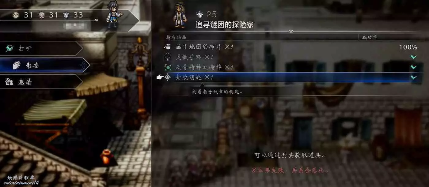 對他使用“索要”地圖指令,即可從他身上獲得“扇的封紋鑰匙”。