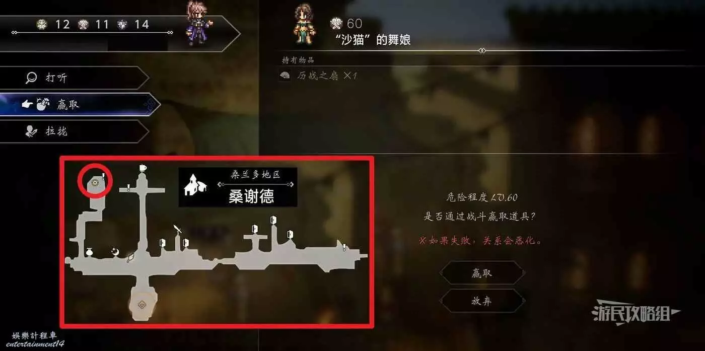 歧路旅人 0 (OCTOPATH TRAVELER 0) 曆戰之扇位置及獲取方法 10 12 月 2025-12-10 廣告 作者:瑞破受氣包 來源:遊民星空 曆戰之扇 屬性:物攻+362、屬攻+382 效果:【攻擊效果】極小幾率降低對方的迴避率 區域:桑蘭多地區-桑謝德 地圖:桑謝德 NPC:“沙貓”的舞娘(弱點為【斧、冰】,擅長群體屬性攻擊和增益自身)