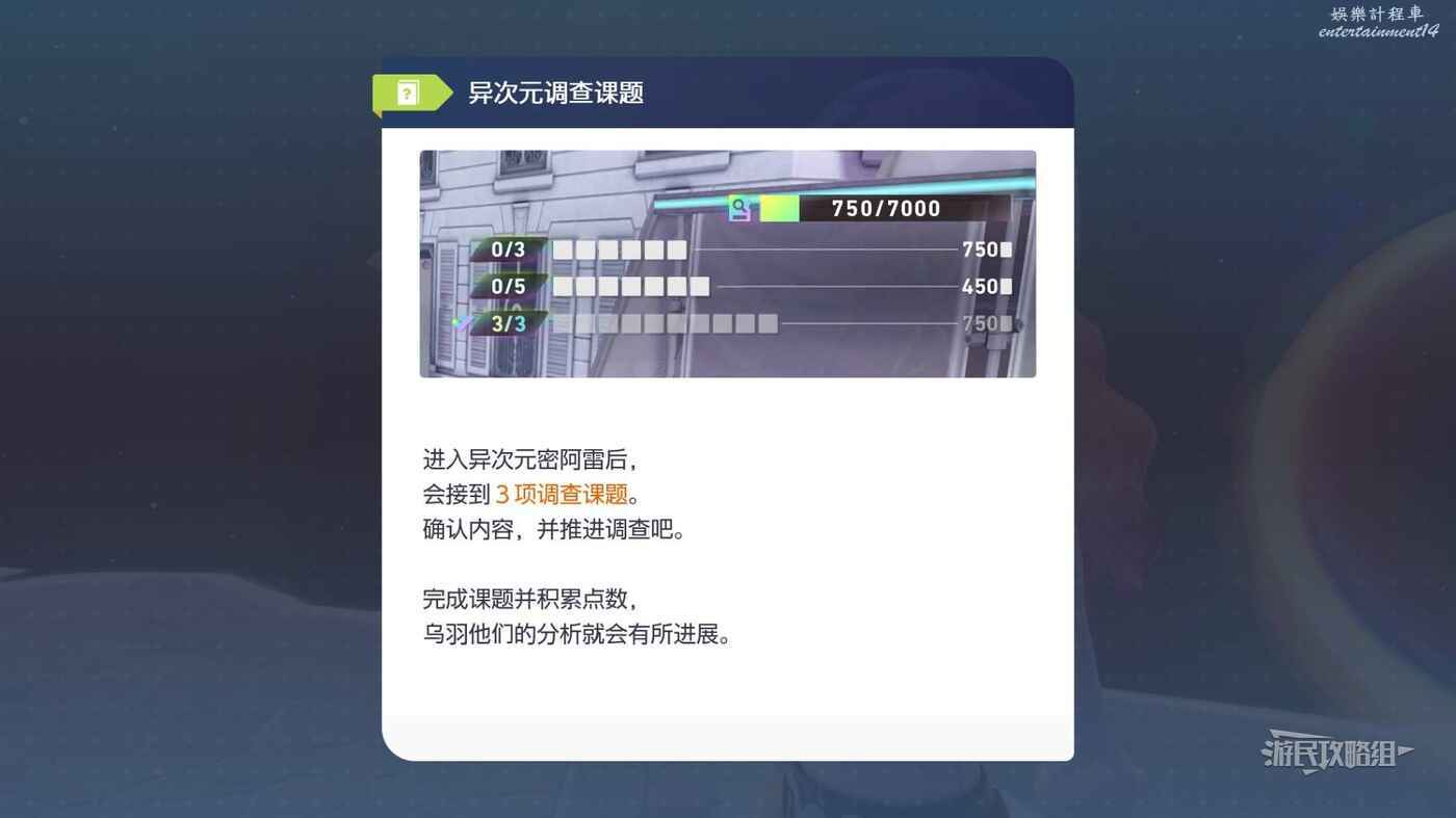 進入異次元密阿雷後,會出現3個課題任務,完成課題任務可以獲得異次元調查點數。不同的異次元密阿雷空間裡出現的課題也各不相同,並且隨著時間流逝,異次元密阿雷消失後,其中的任務也會一同消失。建議進入異次元密阿雷後優先逐個完成課題。