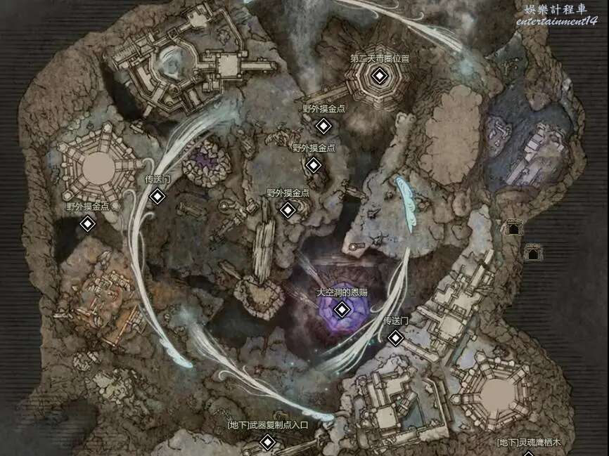 地圖標註了大空洞中所有水晶的刷新點,共 21 個,每個點位都有詳細的圖文說明,幫助玩家快速找到水晶,破除大空洞的詛咒。此外,還標註了野外 boss 的刷新點,並區分了高級 boss 和普通 boss,方便玩家規劃路線,避開危險區域。