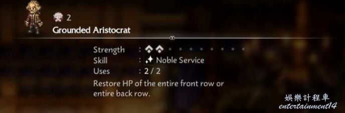 劇場都市的穩重貴族:能夠治療一整排(前排或後排)角色的生命值(HP),是對抗使用範圍攻擊敵人的優秀選擇。