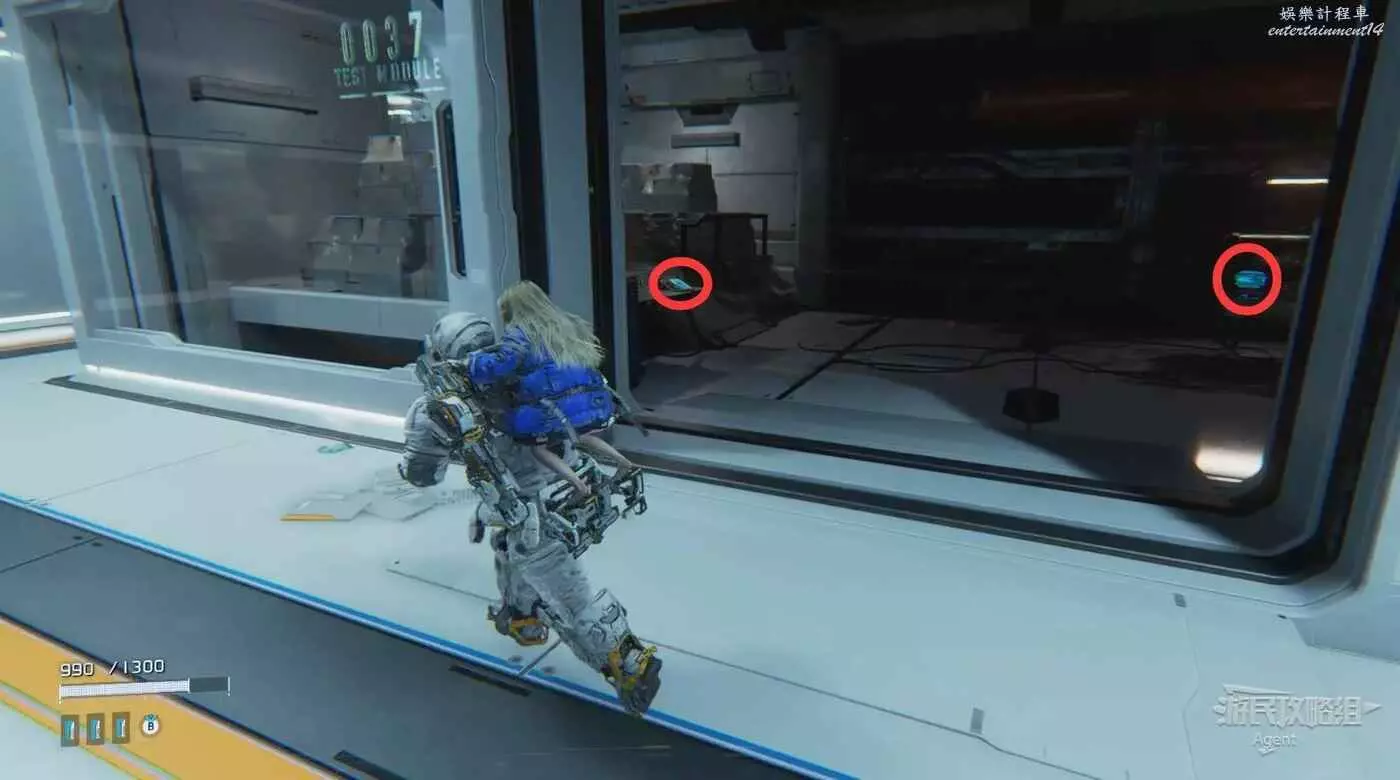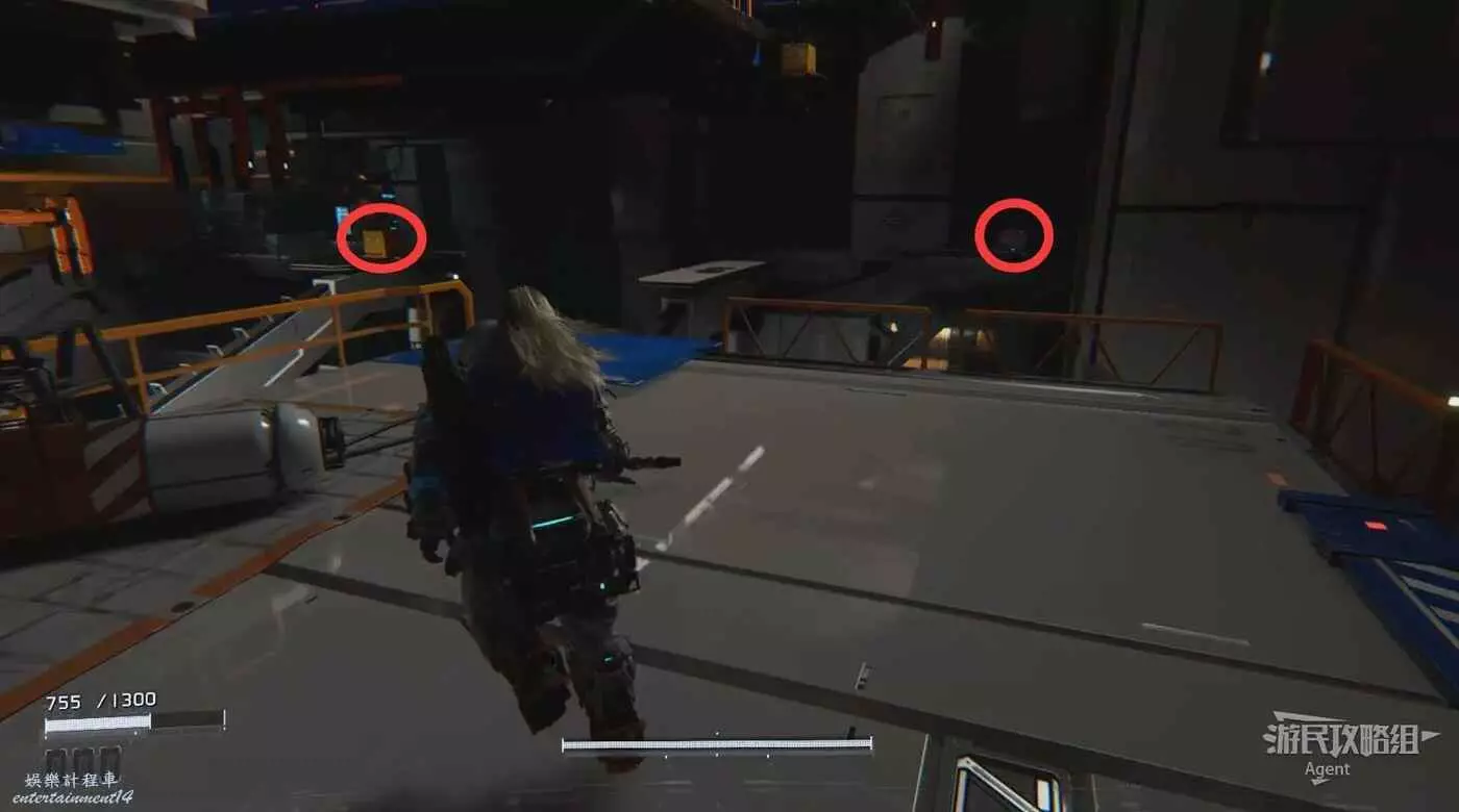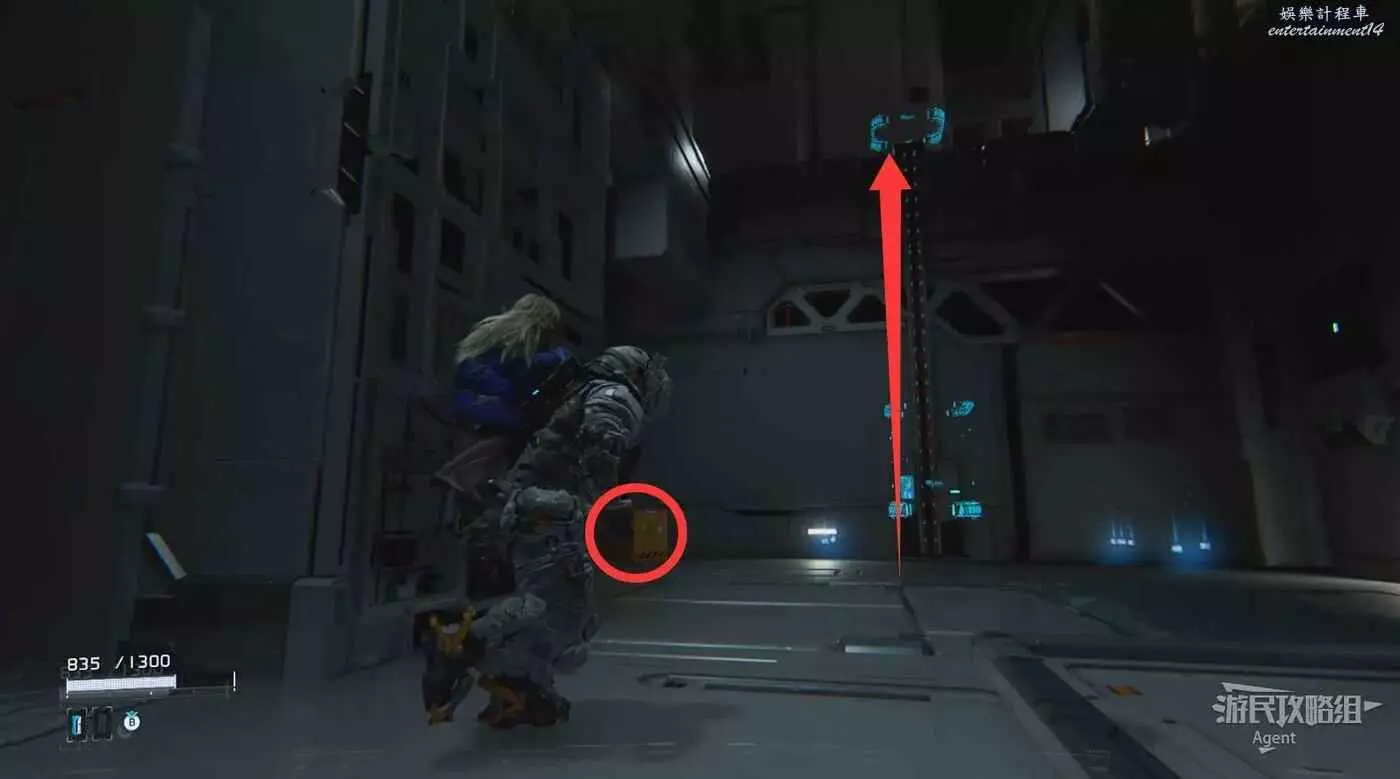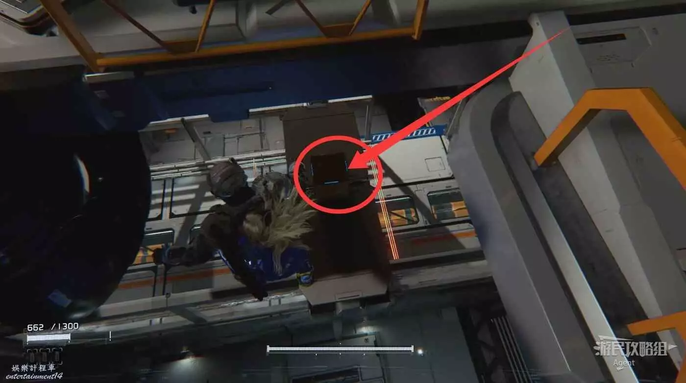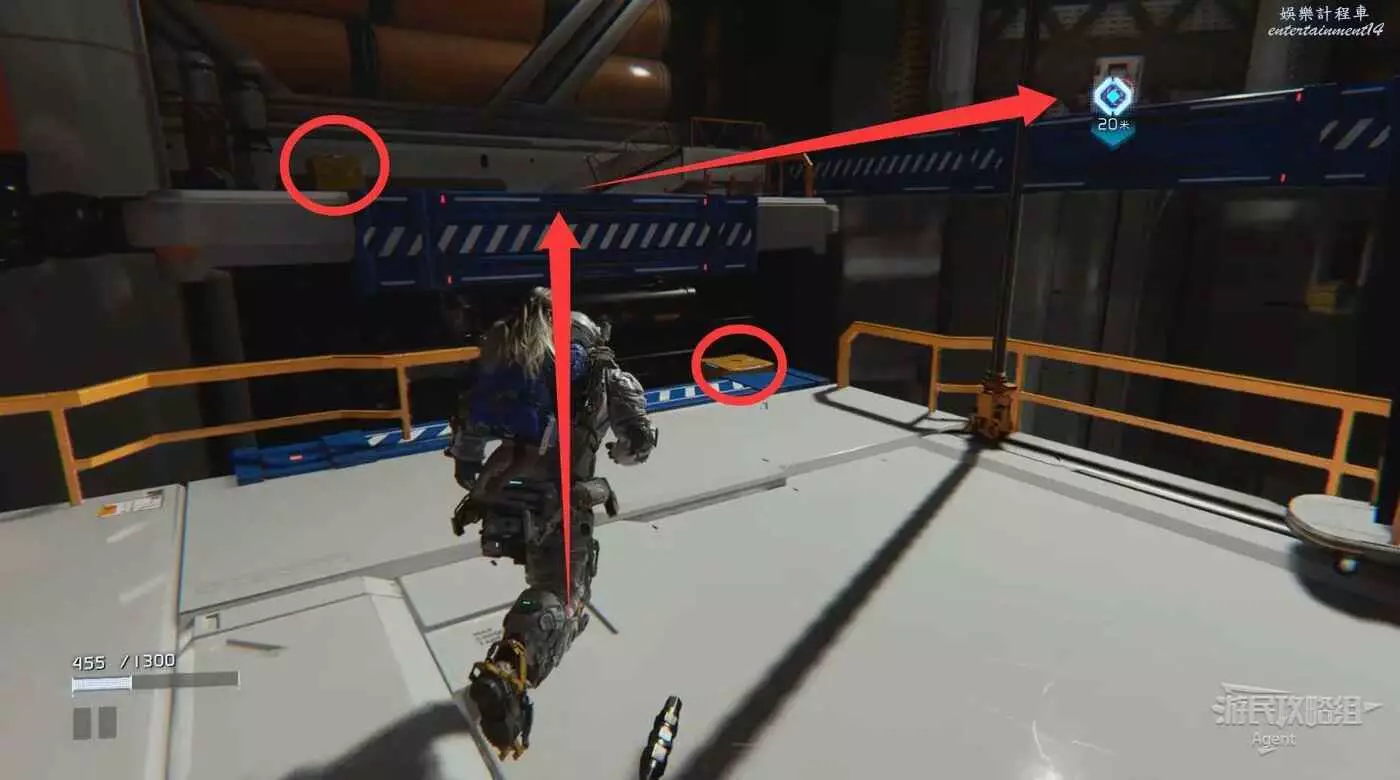 走廊盡頭有個箱子,幹掉走廊上的敵人,到另一頭看到黃色節點但暫時拿不到。