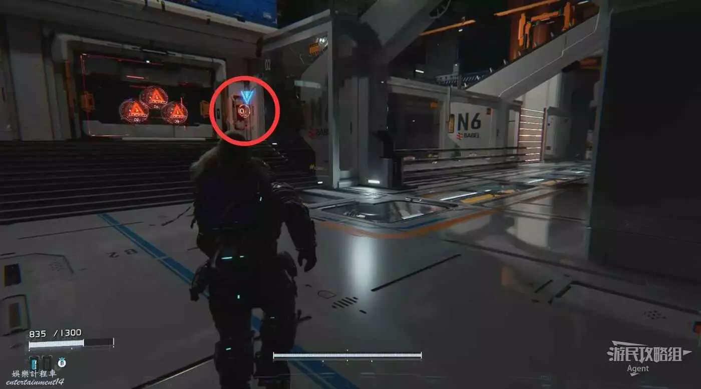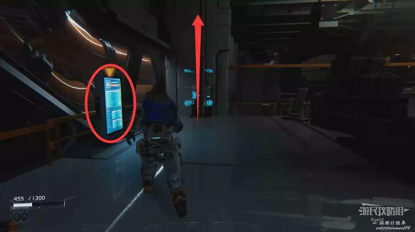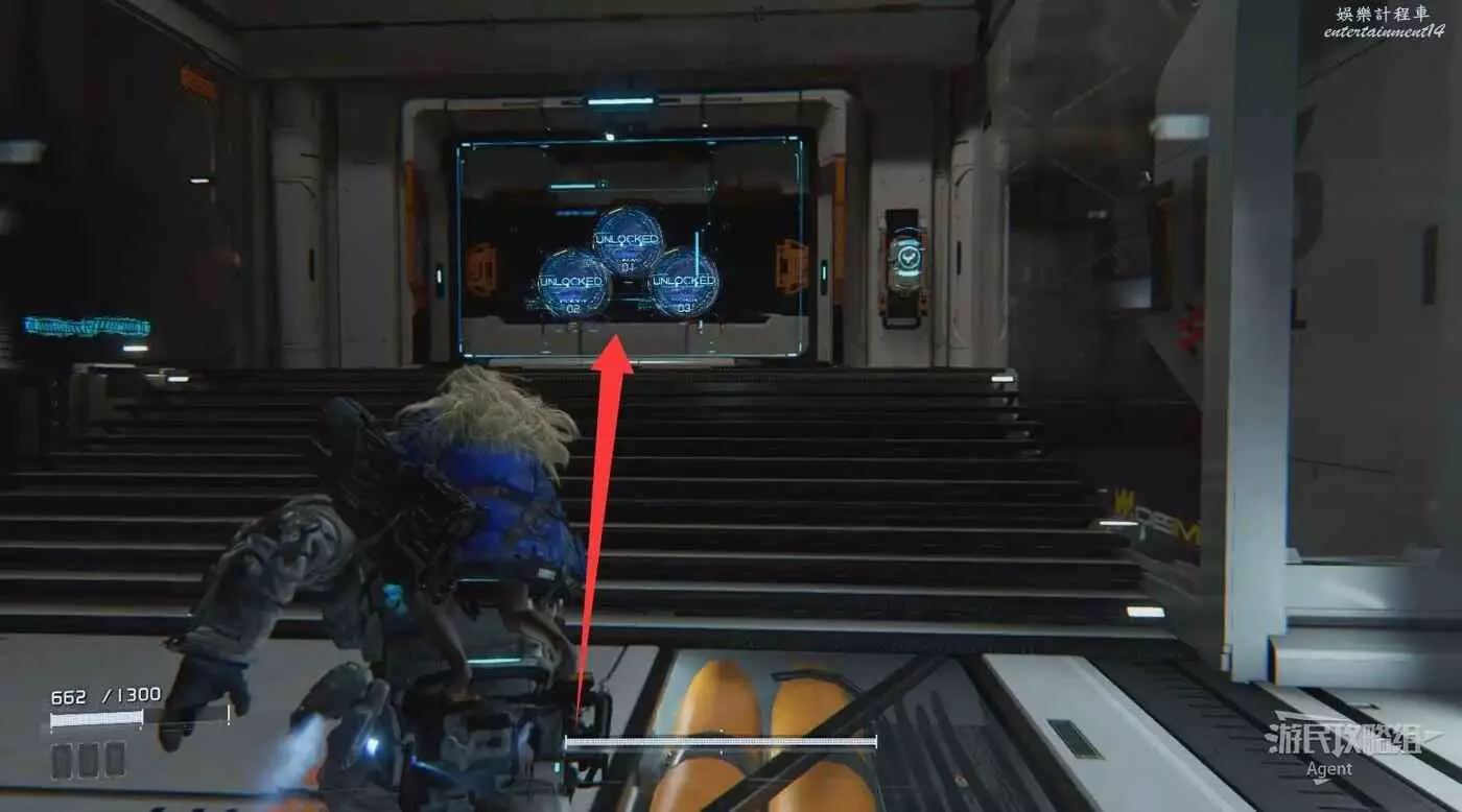侵入紅色面板啟動電梯,地上有武器撿,電梯上升途中和敵人戰鬥時用。