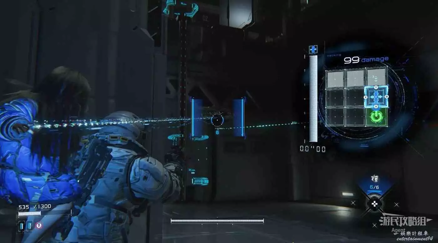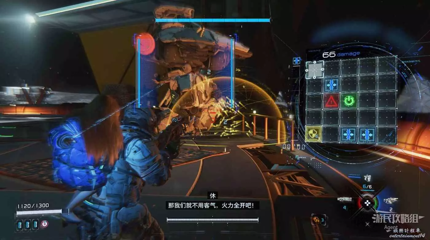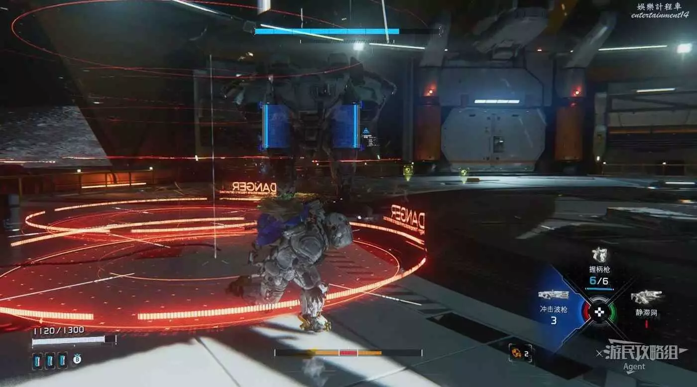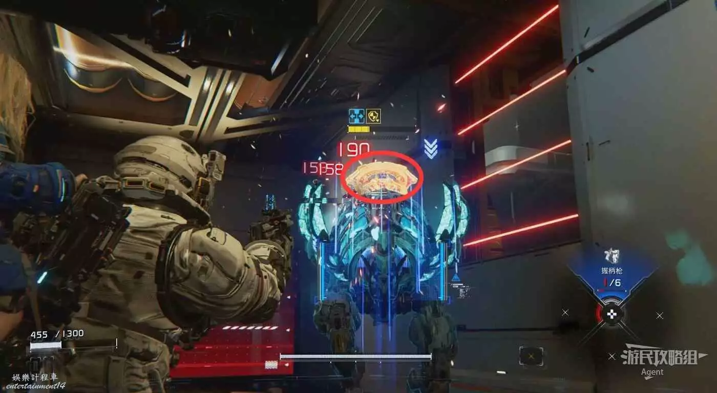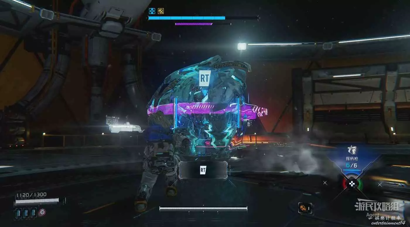 在附近拾取並靈活運用各種武器,用靜滯網槍暫時束縛BOSS,然後趁機侵入連接時多用黃色節點提升傷害,然後用衝擊波槍猛攻。