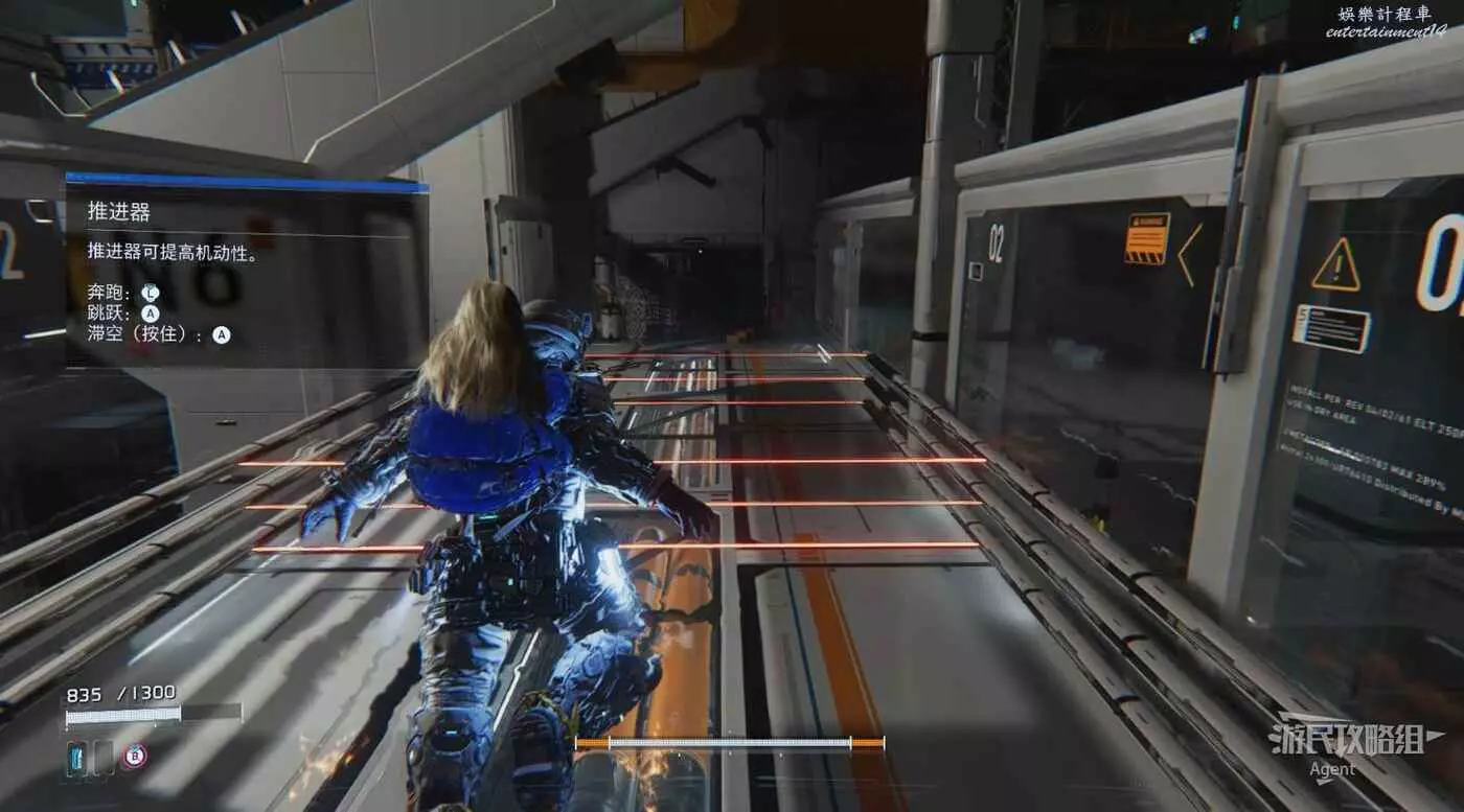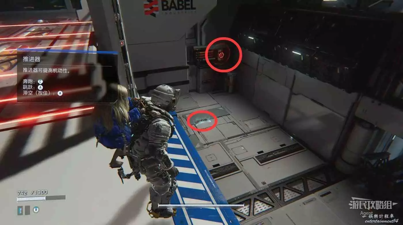 跳起來後按住跳躍鍵可以漂浮一會兒,衝刺跳可以跳得更遠。使用衝刺跳和漂浮越過鐳射障礙。