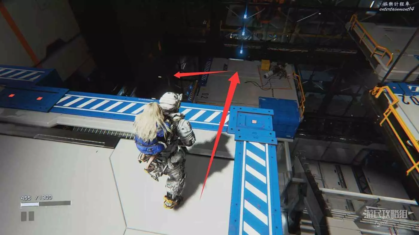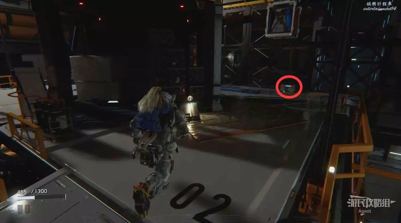 消滅敵人後搜刮個箱子,侵入節點移出平台然後跳上去。
