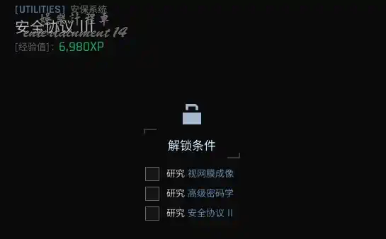 解鎖條件:研究 視網膜成像、研究 高級密碼學、研究 安全協定II、分析樣本約6小時