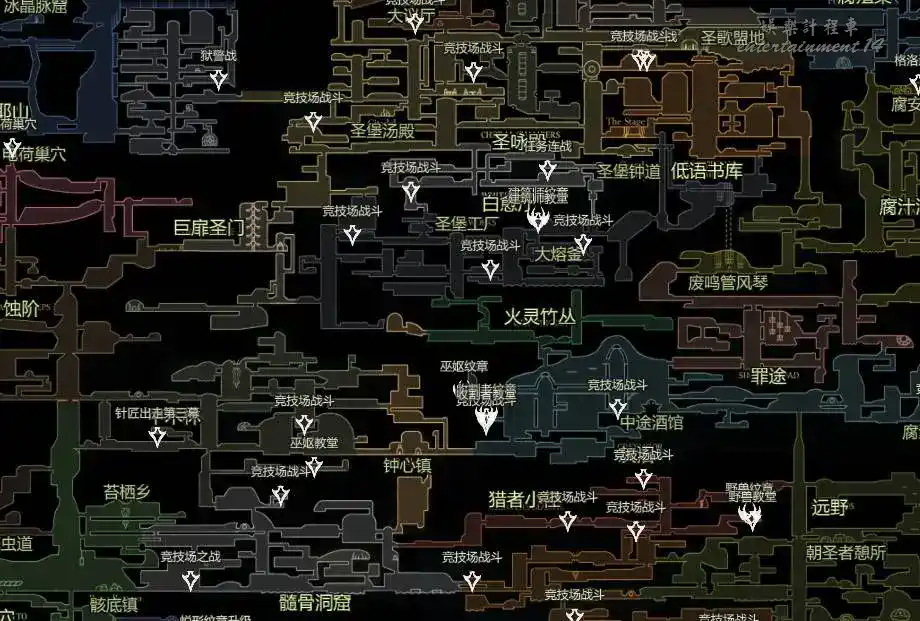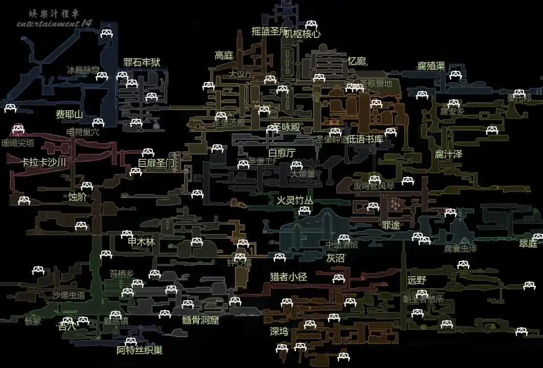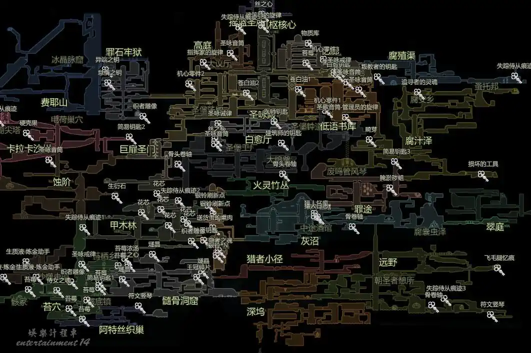 作為一款面向硬核玩家與收集黨的輔助地圖,其資訊覆蓋度堪稱驚豔。從基礎的休憩長椅、快速鈴道,到隱藏洞穴、BOSS 競技場等關鍵節點,標註精準無遺漏;17 種法術技藝、59 種實用工具、9 類強力紋章的獲取座標,不僅附帶場景截圖,更標註了前置解鎖條件(如 “某紋章需先掌握二段跳技能方可獲取”),徹底杜絕 “到了點位拿不到道具” 的尷尬。