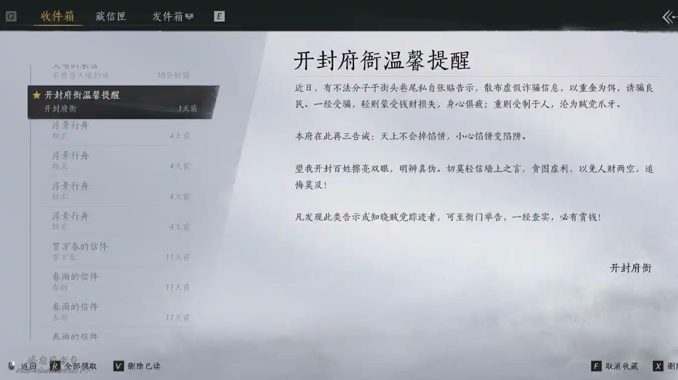 解鎖開封後,前往九流門駐地,有幾率收到開封府發來郵件並觸發任務。
