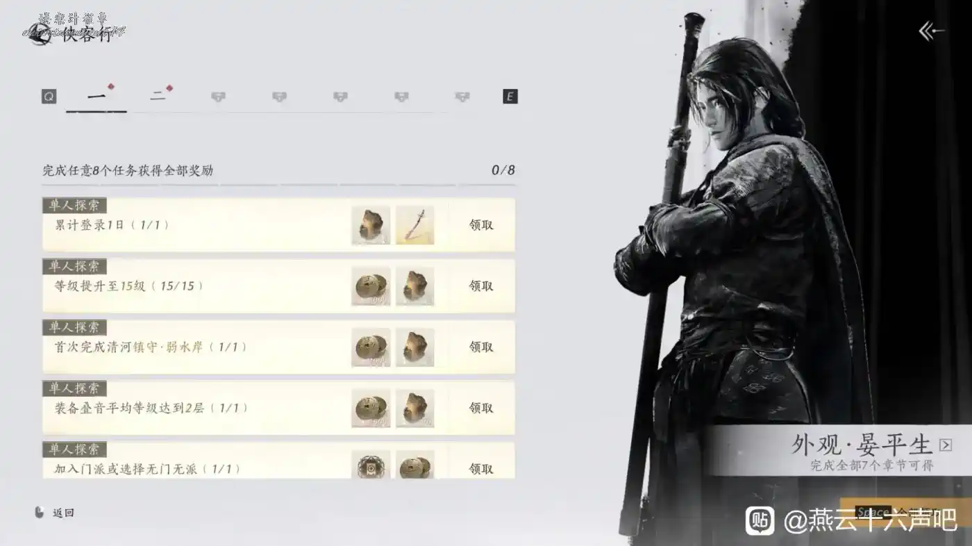 活動說明:活動共分為七個篇章,每日首次登錄會解鎖新的篇章。每個篇章都內含多個任務,完成其中一定數量任務即可領取該篇章所有獎勵。完成全部七個篇章,可獲得時裝·晏平生。