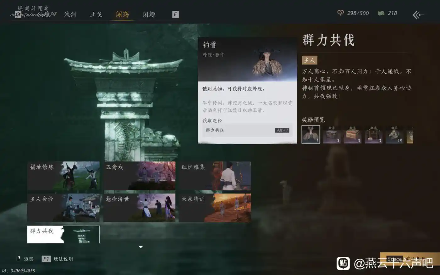 遊戲菜單→同遊→群力共伐,參加群力共伐有幾率掉落釣雪套裝。