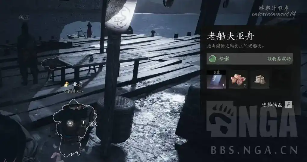 來到背後碼頭上,左邊找到老船夫亞舟,背後使用攝星拿月,取走這本“破舟拳義”。