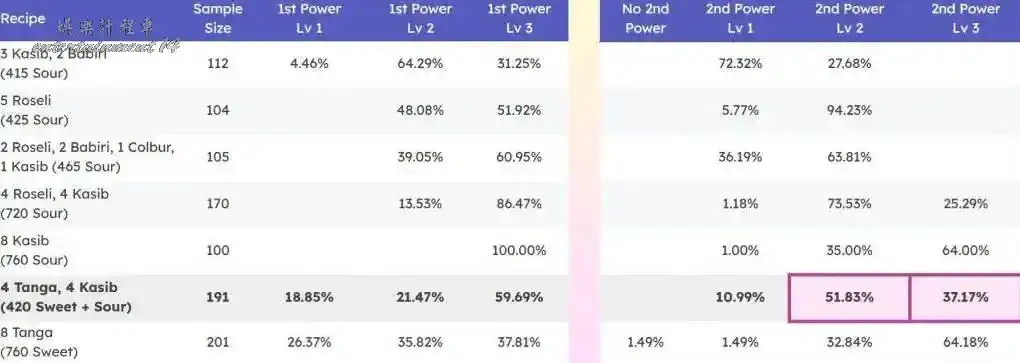 第二 綜合甜甜圈可以以更低的數值刷出lv3的第二技能(統計結果裡面 單口味甜甜圈不到700都是出不了lv3第二技能的 也就不可能有雙lv3)。