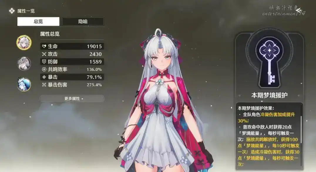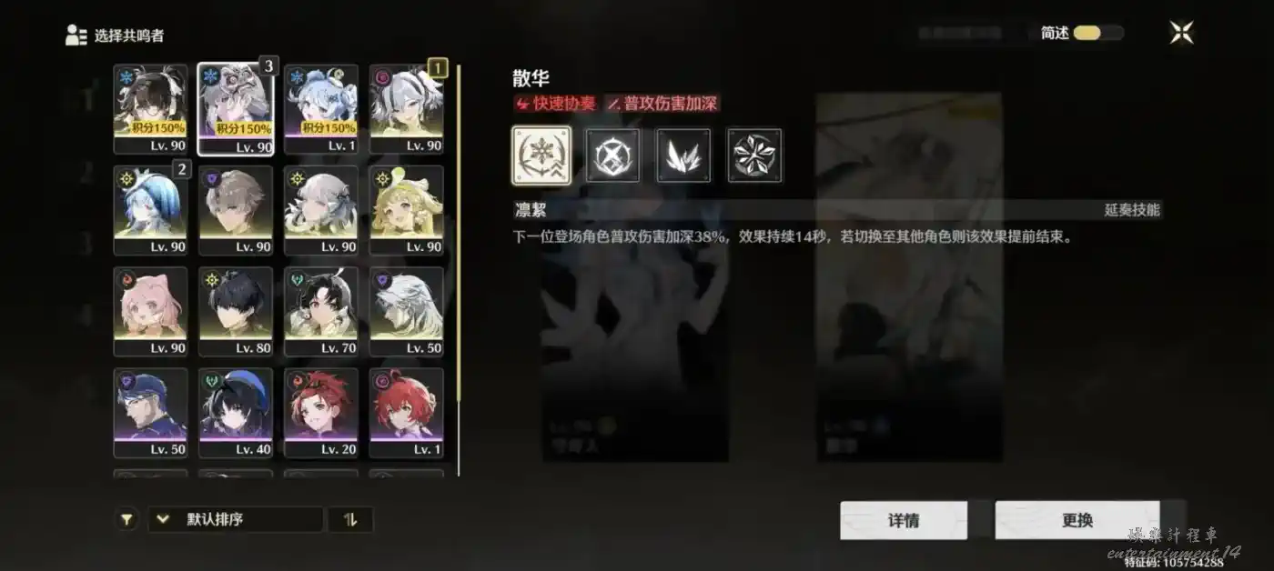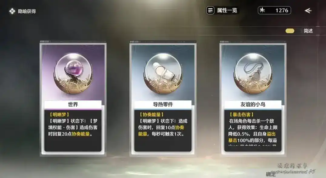 選擇冰爆流派時,則要收集加協奏能量、明晰夢時長和夢境能量的隱喻,如“隔熱零件”“導熱零件”“世界”等。由於需要快速協奏,角色建議帶維裡奈和散華