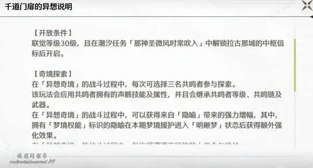 通過普攻和技能獲得夢境能量。當夢境能量充滿到500點後,明晰夢狀態被啟動,持續10秒。角色在此期間獲得100%共鳴效率加成、50%暴擊加成和技能CD減少50%