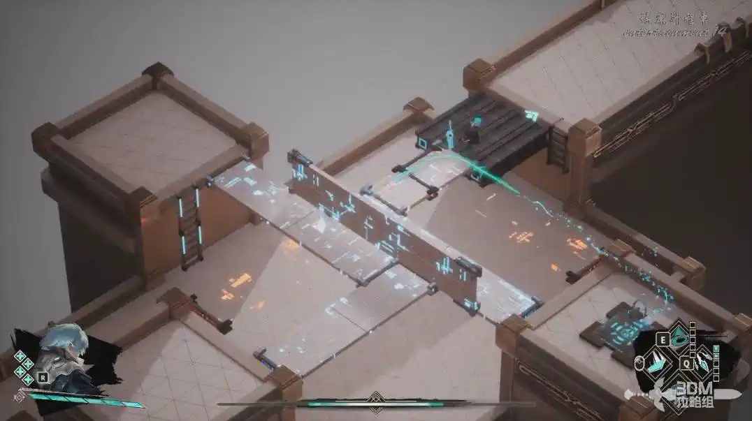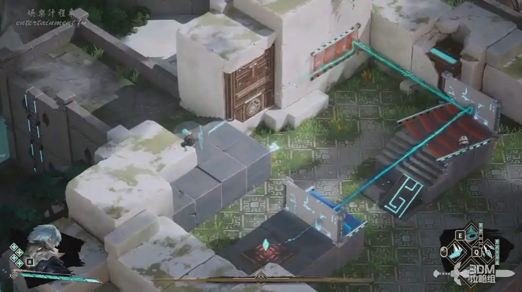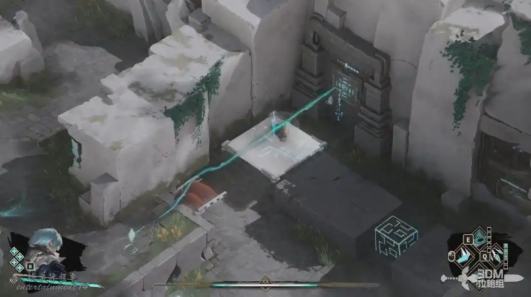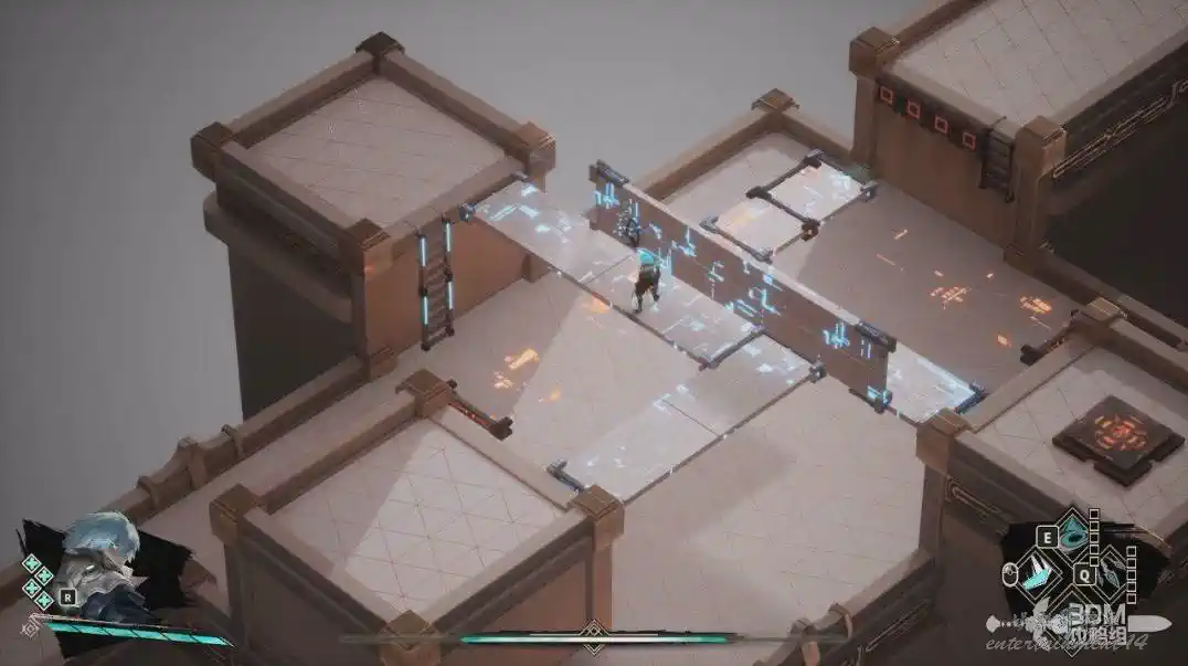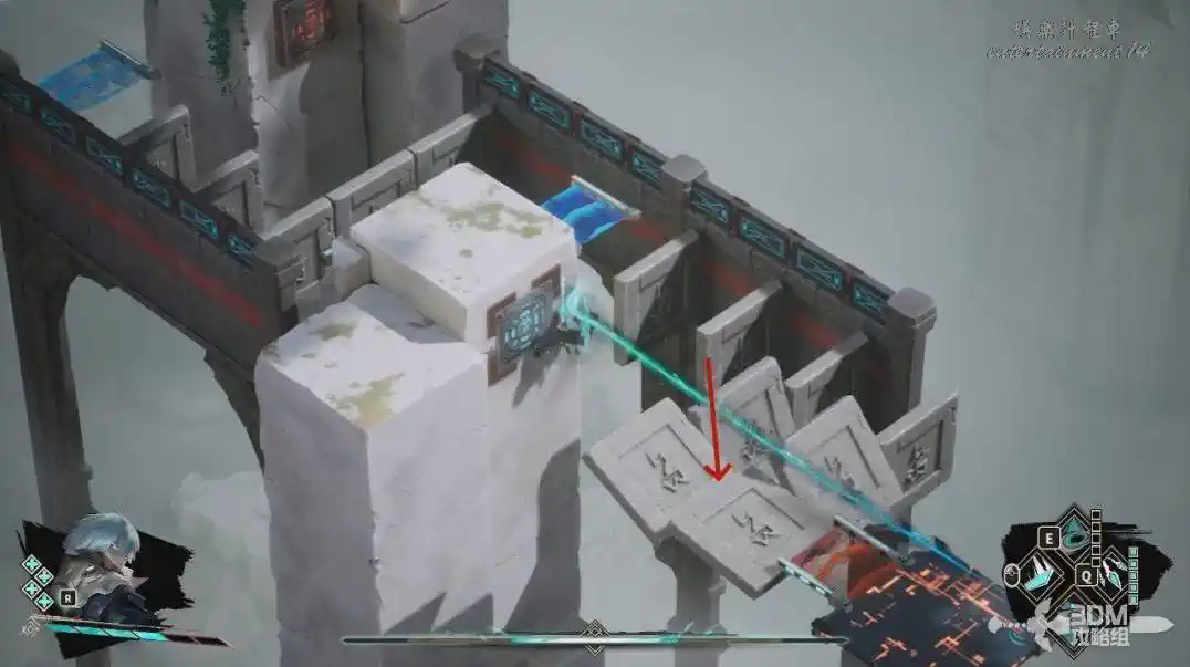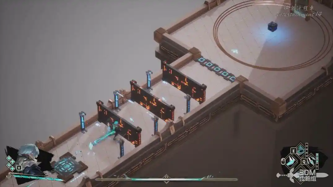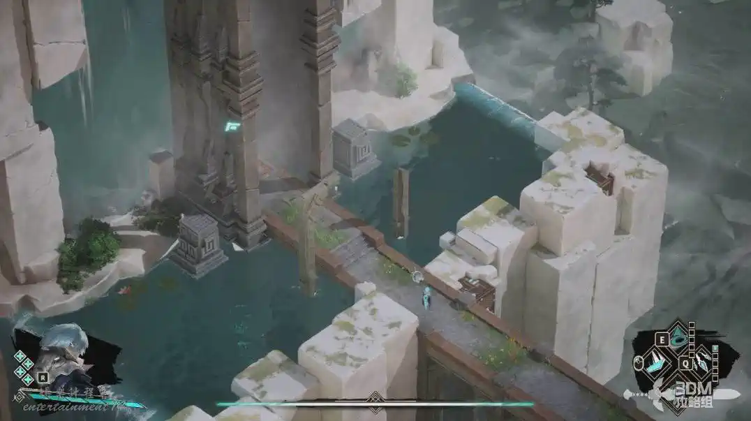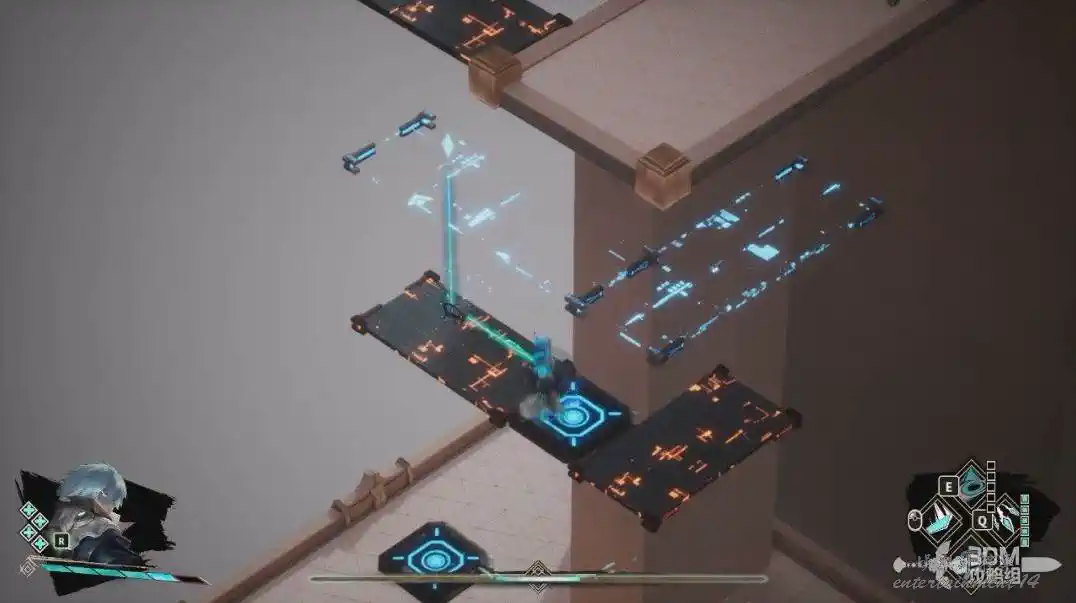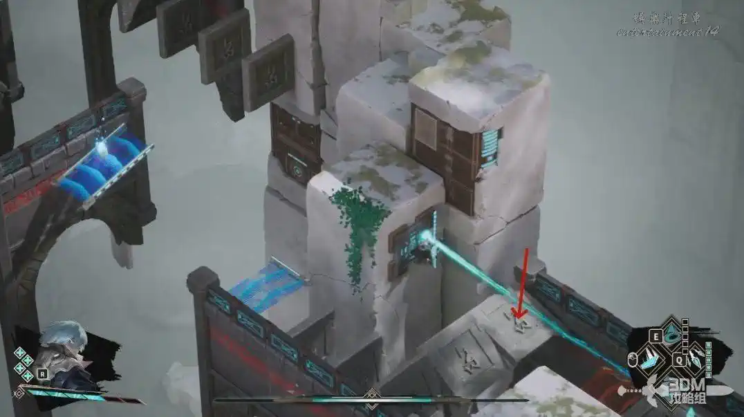 左邊有一個小解密。我們先踩一下右邊的機關,讓白色的平臺過來,我們站在上面,等它貼牆後我們開回溯下去點亮下方的機關,然後回溯就能進門了。這次的魔方還是反覆運算晶片。