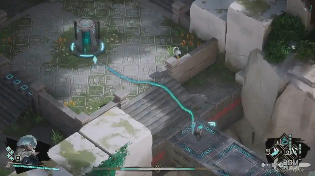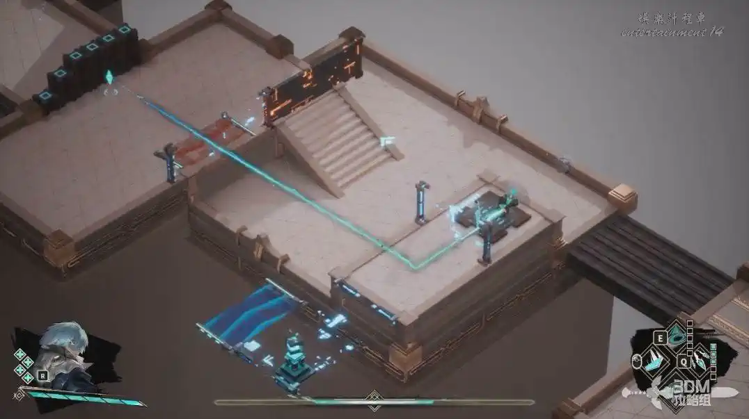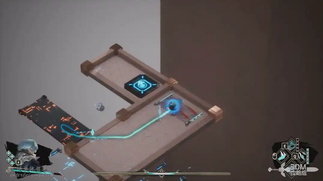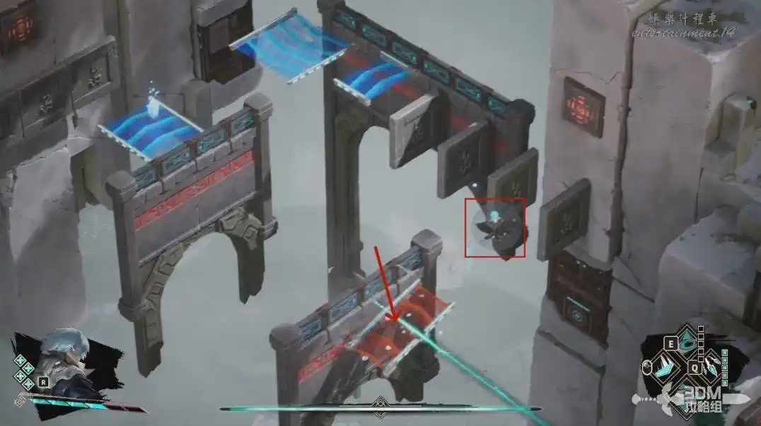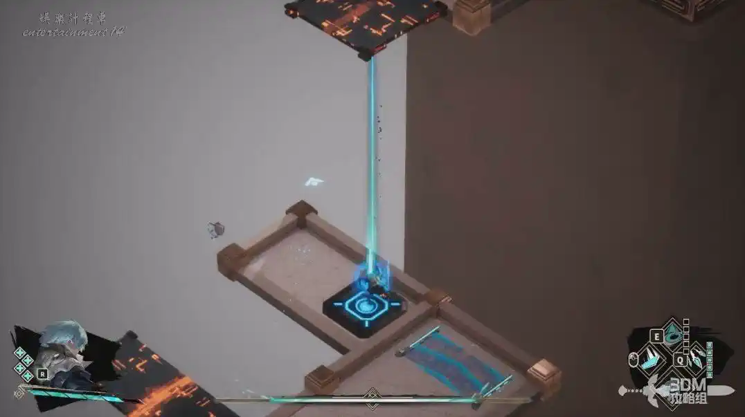 前面的魔方拿到後繼續往上面走。這邊的解密我們先開啟回溯踩上面的彈射板,彈射過去後按住右鍵回溯踩到這個隱藏的地板上,站在上麵點亮一下機關,右邊的門就可以通過了。