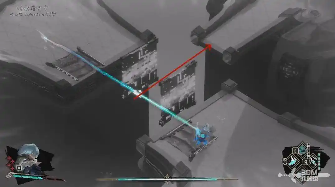 具體操作就是站在門那個位置開啟回溯,然後去踩彈射機關,看到我們身上有藍色的箭頭以後回溯回去,利用慣性彈到對面。