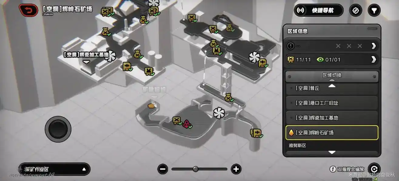 絕區零 (Zenless Zone Zero) 2.5隱藏地圖進入方法 30 12 月 2025-12-30 廣告 作者:傲嬌的盤俊秋 來源:米遊社論壇 輝瓷加工基地 首先傳送到這個位置 坐左手邊電梯下去 沒開錨點的從這裡進入 走樓梯、坐電梯或者直接傳送都行,到這個位置 視角向前,往正前方直走,有個電梯 坐電梯到了新的區域,就能在小地圖上看到第二個觀測奇點了。 輝嶺石礦場 我們先傳到最下面這個錨點 朝這個洞走,走到這個位置
