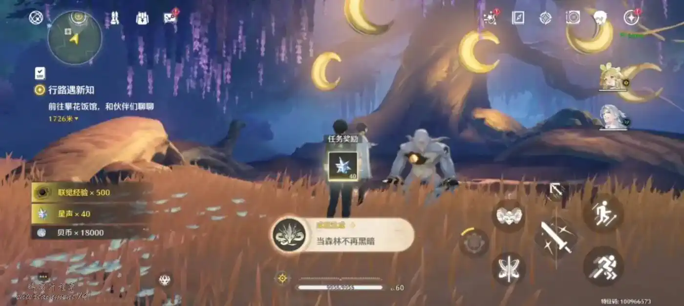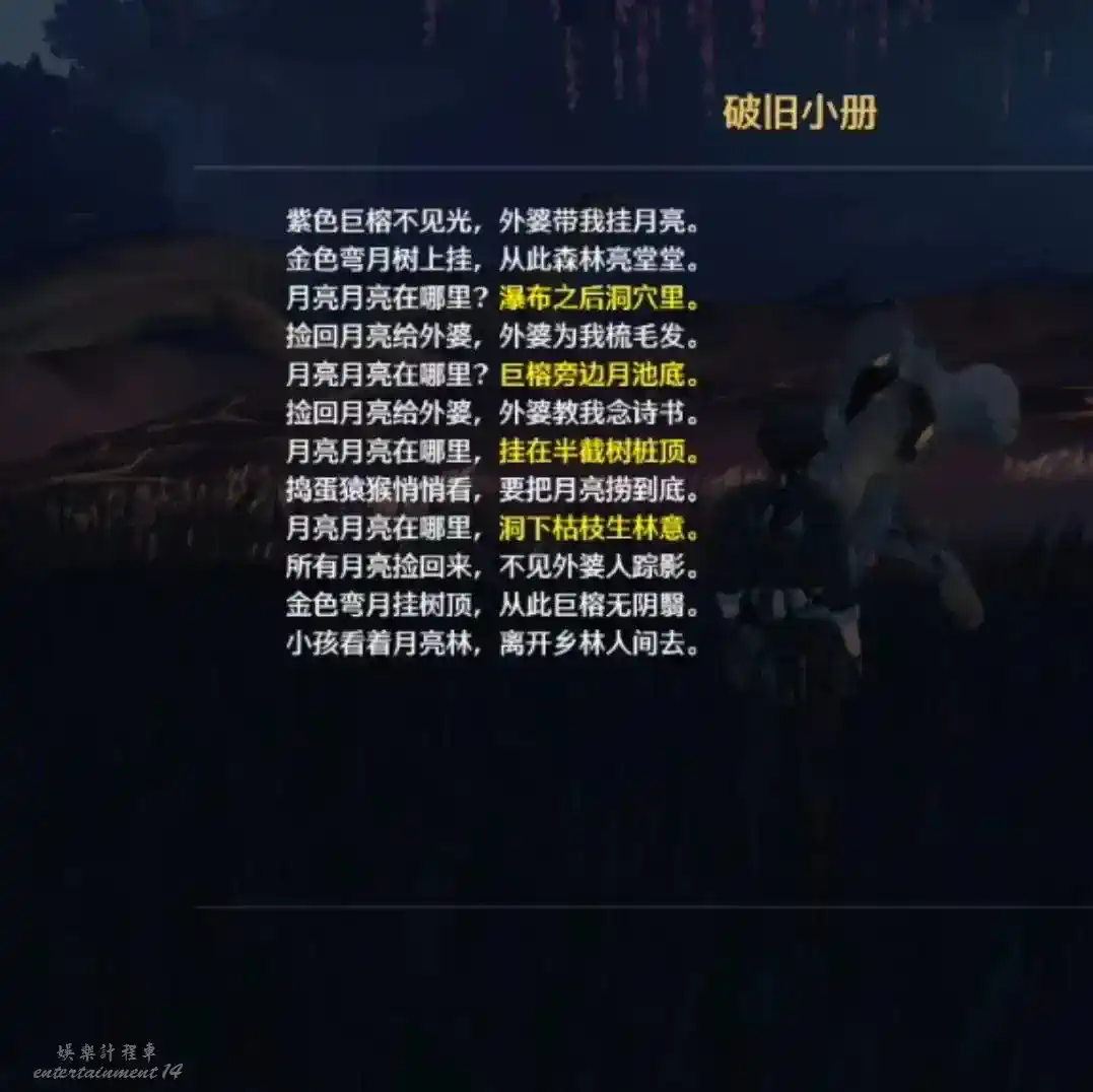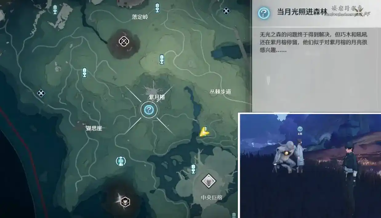 鳴潮 (Wuthering Waves) 當月光照進森林任務完成方法 30 12 月 2025-12-30 廣告 作者:展無落 來源:庫街區 目標:找齊4個人造月亮 傳到紫月榕附近信標,地圖會有觸發任務。 與npc交談後,會有一本小冊童謠指明4處人造月亮位置。(再一次交談才會更新地圖資訊) 小冊童謠的提示 按更新後的地圖資訊,尋找4個人造月亮,分別在巨榕月池、信標附近的瀑布山洞裡、最南邊洞穴枯枝下、東面大樹樁頂。(自上而下) 最後,返回npc處提交物品,任務結束得成就「當森林不再黑暗」。