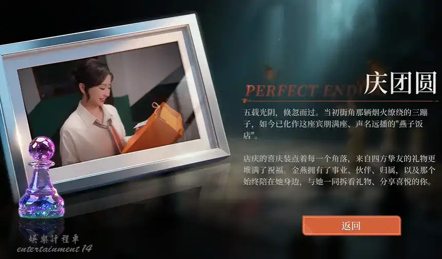 命運遊戲 3 王者棋局 慶團圓結局達成條件一覽 30 12 月 2025-12-30 廣告 來源:互聯網 條件: 芷蓮死亡,方瀟玉存活,金燕好感度大於10 結局顯示: 2010年在房間醒來與方瀟玉聊天,了解近況。 表示自己想走走,在馬路邊會看到金燕到她準備擺攤。 和她一起,最後與金燕喝酒聊天。 2015年燕子飯店,開了自己的飯店。 最後即可解鎖慶團圓結局。