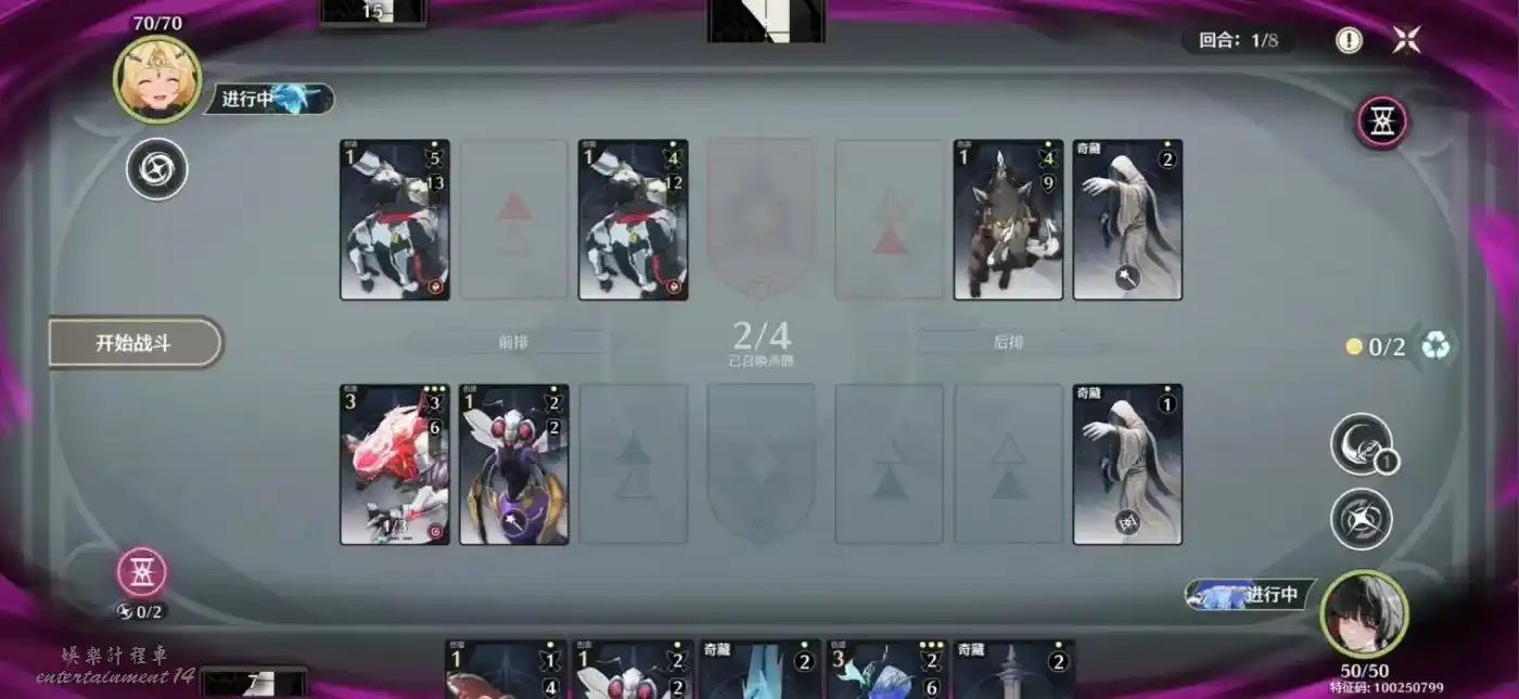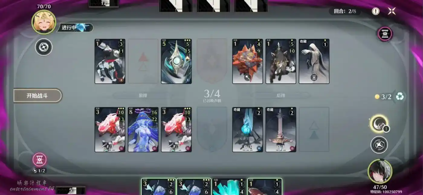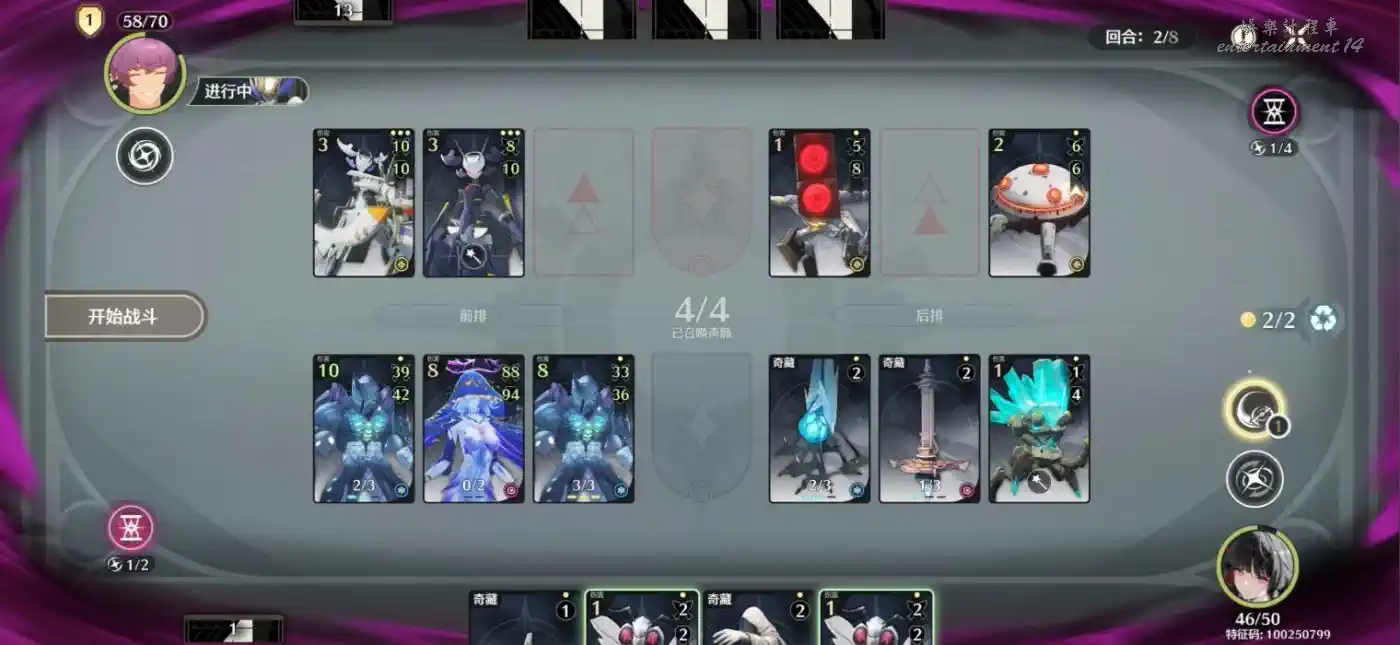 最後,在你刷到不想刷的時候,也可以選擇將奇藏:刻像路標重新放在場上,然後再將之前兩個奇藏重新上場(劃到右側賣掉再使用幼岩或角色戰術技能抽牌),就像下圖這個樣子,就可以開始戰痘啦。