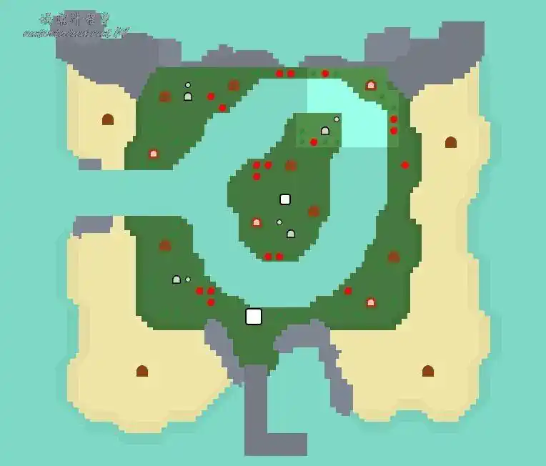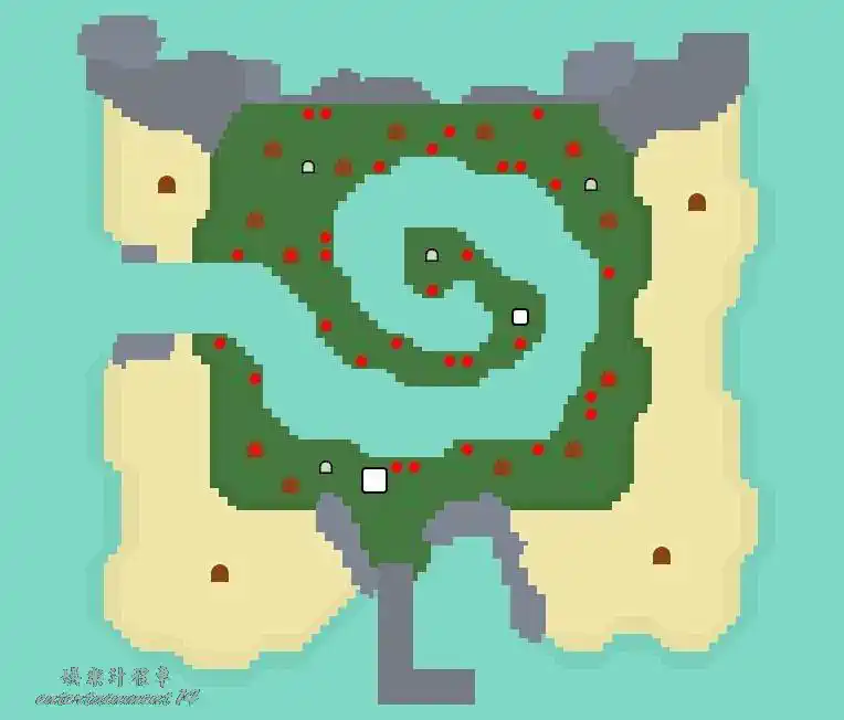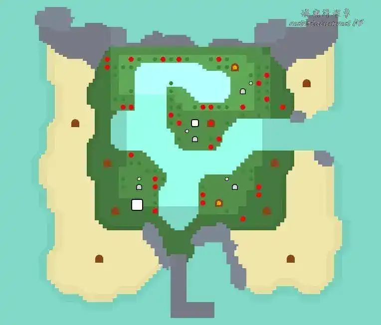 地形:單層島,一條細窄的河流包圍著中間的大片陸地,無需撐杆跳就能跳過
