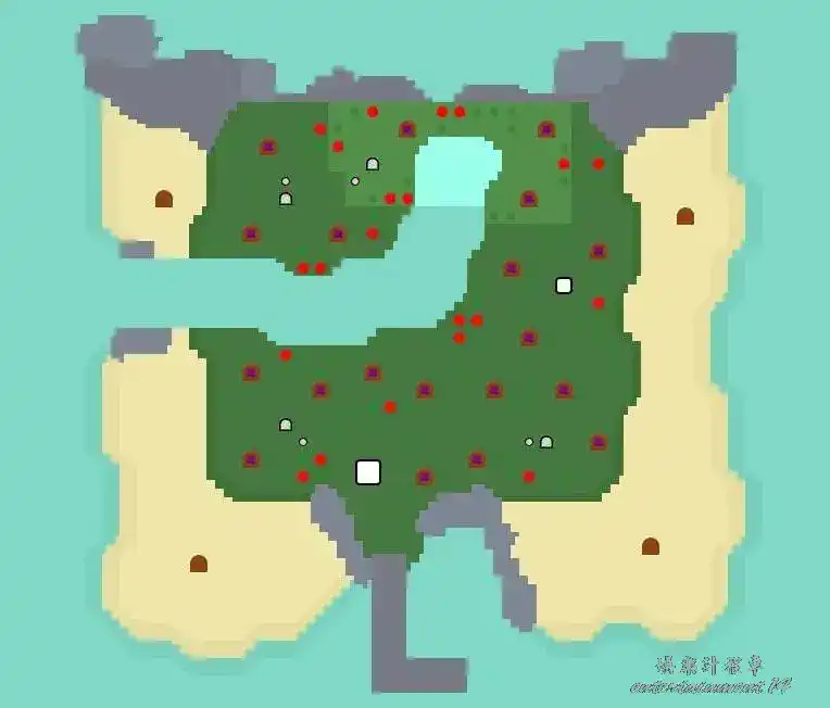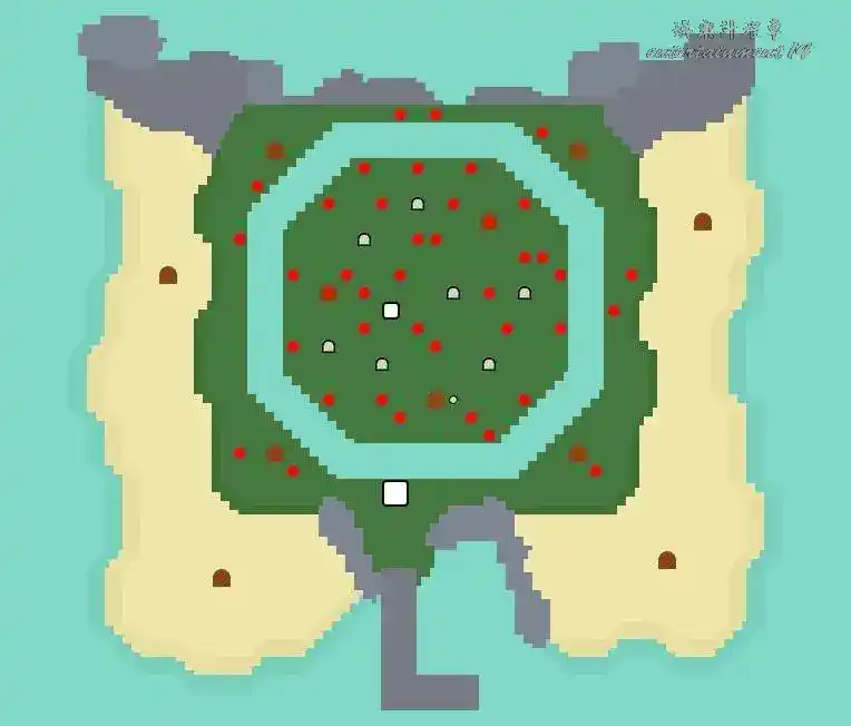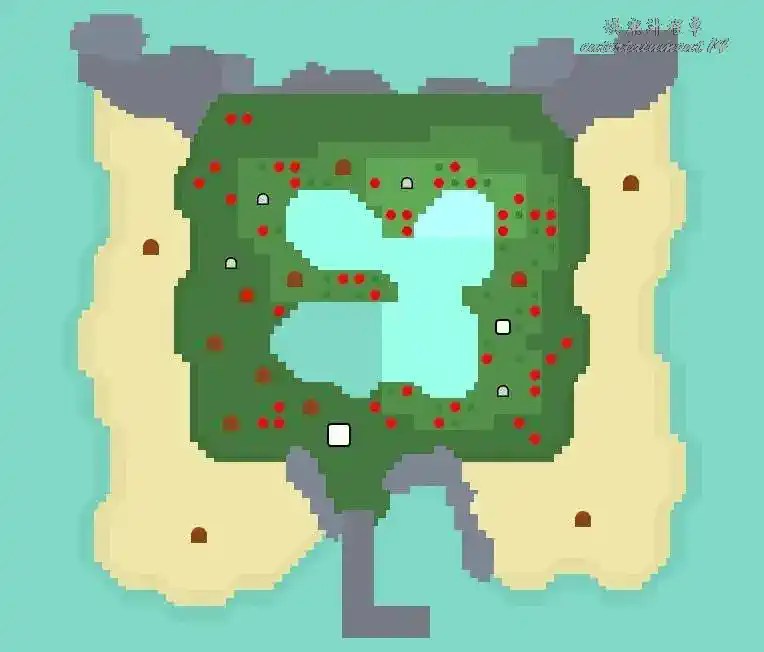 地形:雙層島,一層有個指尖陀螺形狀的大池塘,西北方有高地
