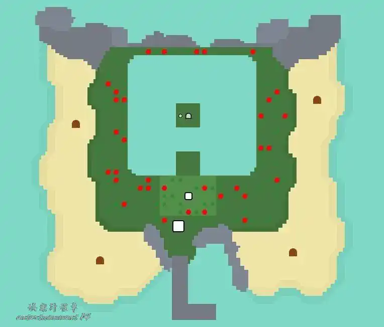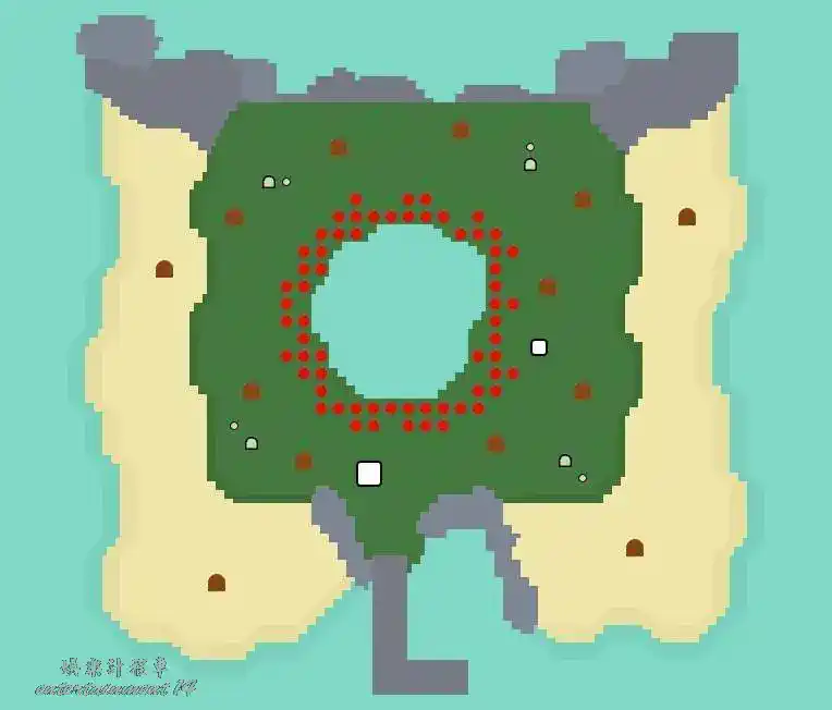 地形:單層島,大池塘中央有一小片陸地,敲碎池塘北部的岩石可以通過撐杆跳到達