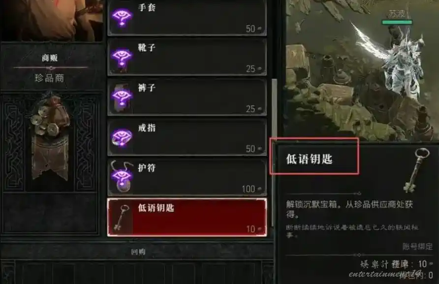 用於開啟地圖上的沉默寶箱。你只需要在任意主城找到珍品商,用20個低語古幣就能直接購買。