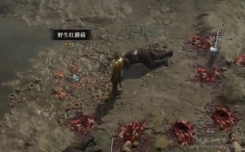 前往該區域,你需要仔細在地上尋找一朵紅色的蘑菇。它的具體位置通常在一片黃色流膿的沼澤地面中間,比較顯眼。