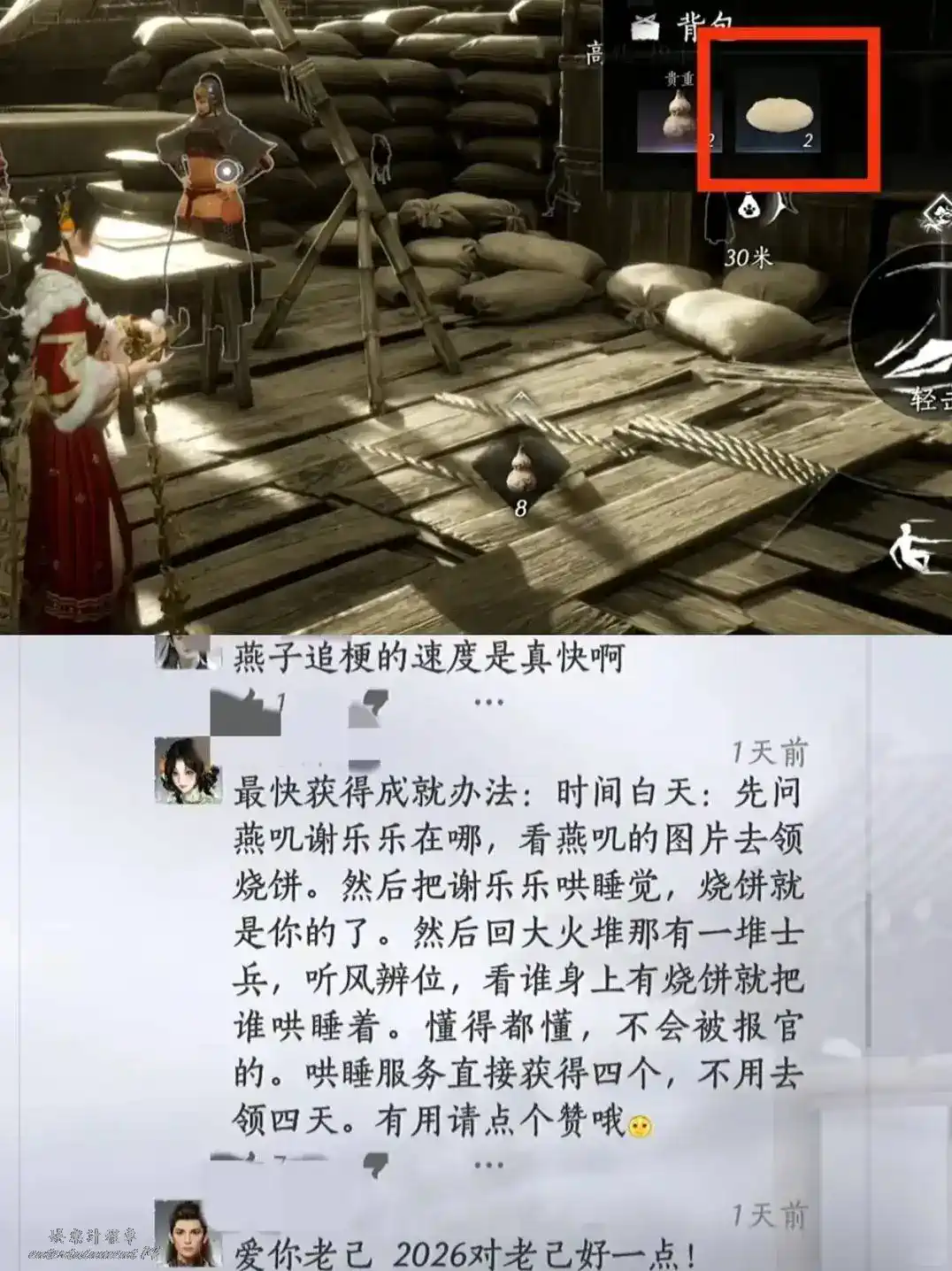 燕雲十六聲 愛你老己成就快速達成方法 5 1 月 2026-01-05 廣告 作者:易易 來源:微信公眾號 ①到下圖紅框位置找到謝樂樂,購買一個燒餅,獲得第一個成就“愛你小己”(燒餅每天限購一個) ②到下圖紅框位置找到火堆烤餅,烤3個,可獲得成就“愛你老己” ③如何一天之內,5min內獲取兩個成就? 見下圖,開聽風見誰的身上有燒餅,哄睡,可快速獲取多個燒餅。