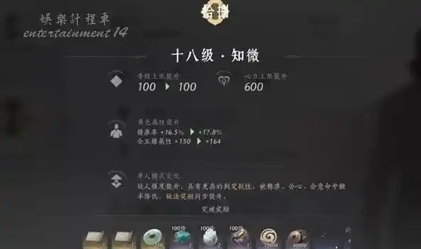武學開放突破,雖不升級但能獲得新能力。奇術等級上限提升至25級。