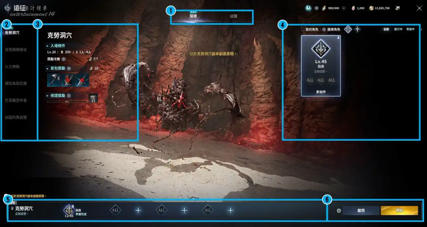 | 2 | 副本列表 | 可確認副本列表,選擇欲遊玩的副本後,可確認相關資訊並創建隊伍 | |