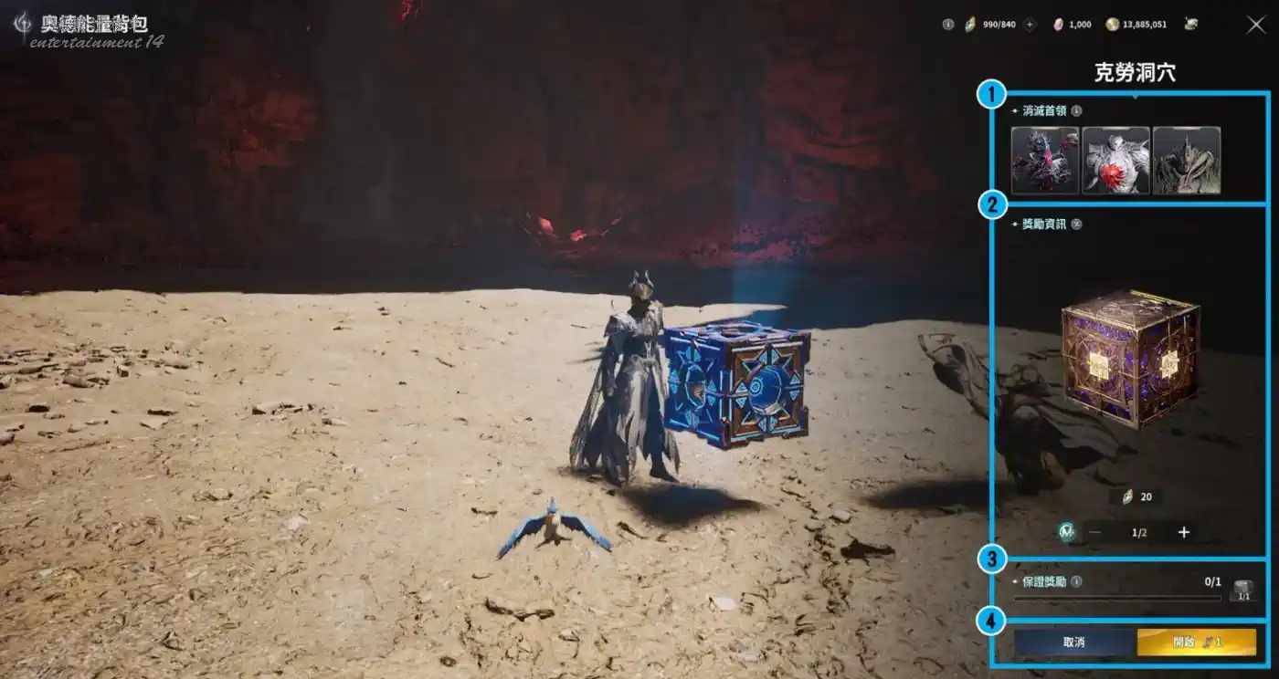 | 3 | 保證獎勵 | 背包凝聚能量充滿時,可獲得保證獎勵。 需領取保證獎勵後,才可重新進入副本 |