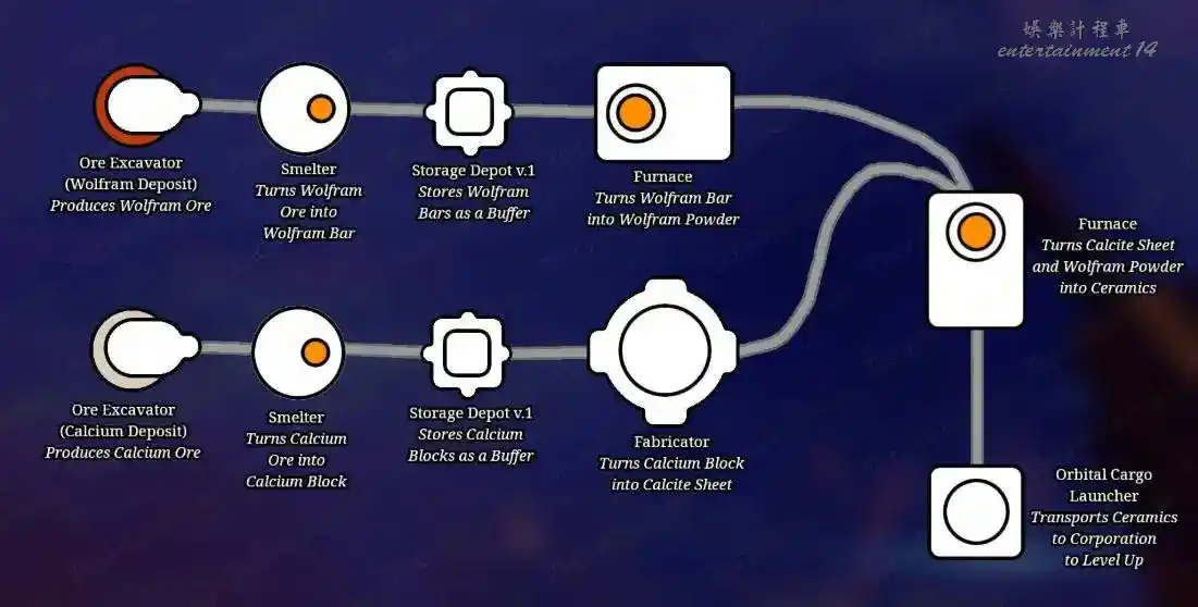 1.礦石開採:陶瓷需要沃爾夫拉姆和鈣,所以你至少需要在這些礦床上放置一台礦石挖掘機。
