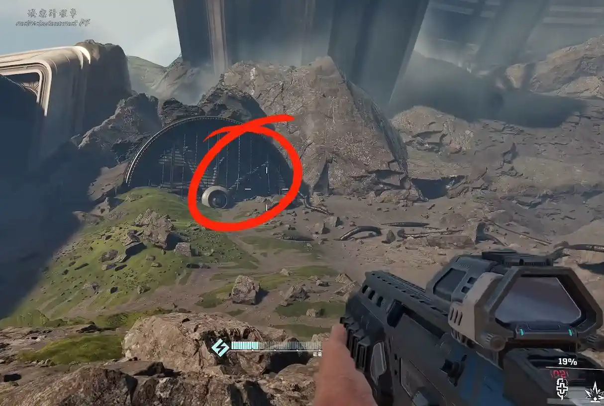 前往地圖上標記為 【遺忘引擎】 的地點,其外觀為一個巨大的管道狀建築,非常醒目。