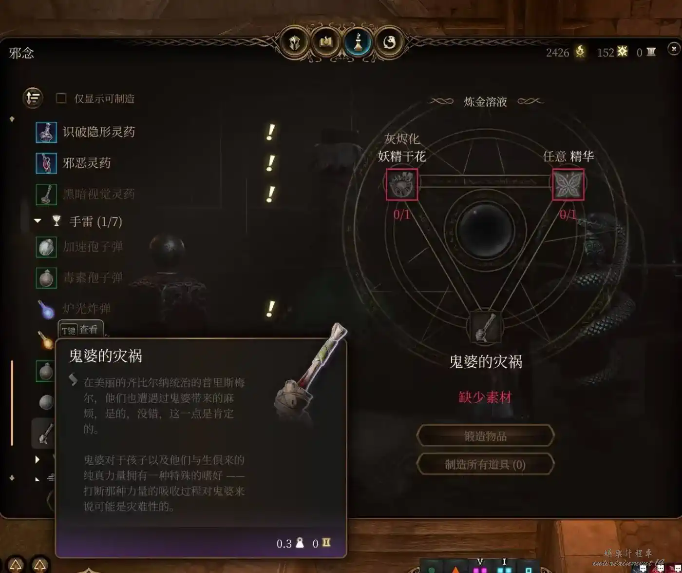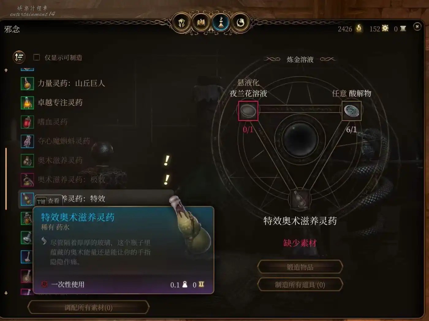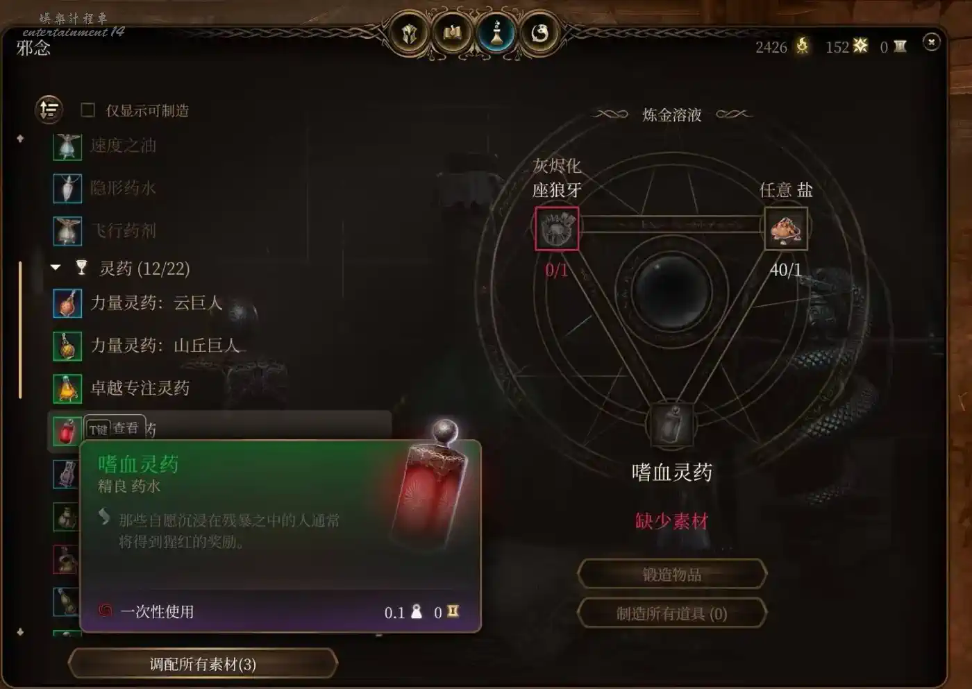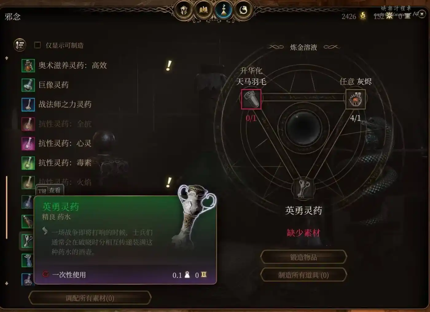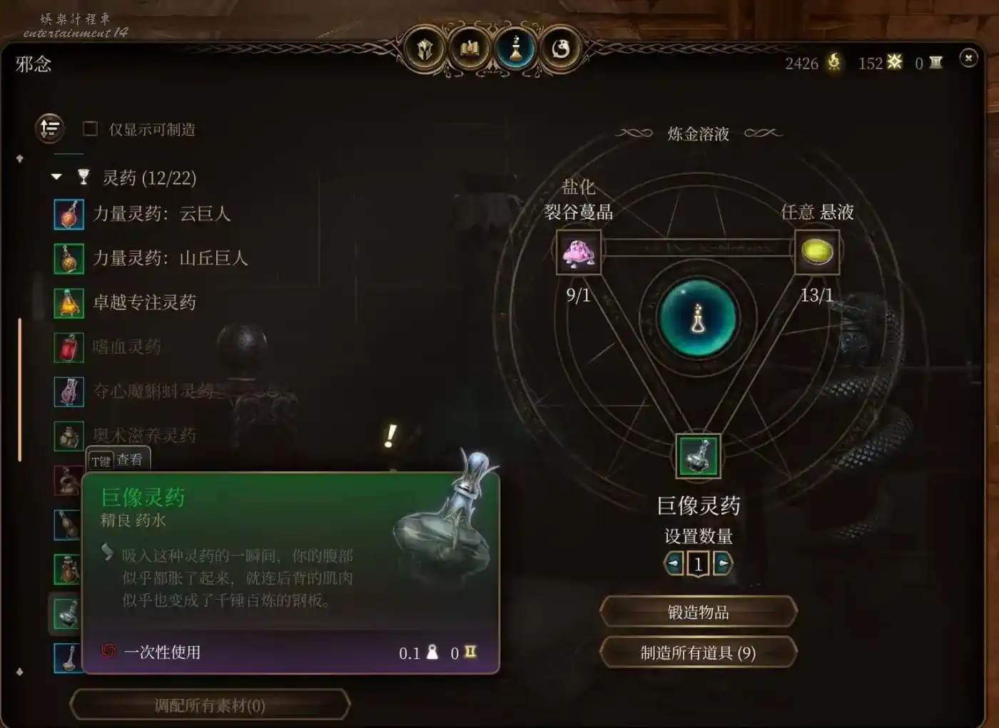 合成材料用山丘巨人手指,雲巨人手指。山丘巨人藥直接買在第一章鬼婆那裡刷新一次賣3瓶,量大管飽。話說這鬼婆身上都是寶吧,山丘巨人藥,頭皮,離愁魔杖,長休藥,+1DC戒指,這遊戲最大的慈善家。鬼婆殺了可以去蕈人營地找大地精和蘑菇商人買。雲巨人力量藥和材料人物7級還是8級後商人也開始出售,第二章可以找軍需官和羅阿月光,第三章馬戲團狗頭人,丹瑟隆飛斧武器店和它樓上藥材店,白骨斗篷藥材店,底城廢墟傳送點旁的商人都會賣。
