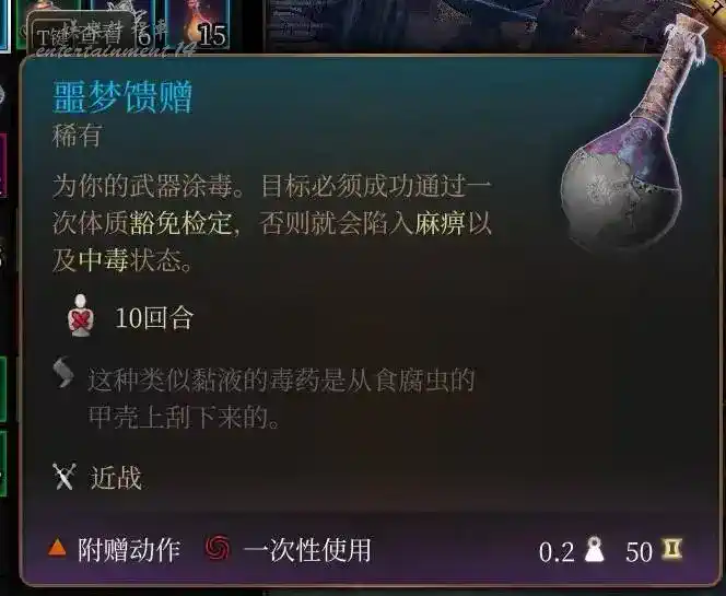 噩夢饋贈還有個投擲版本的,也是固定豁免難度15,能在第二章護士那裡買或掉,第三章變形怪敵人和多洛身上也有,這個版本的麻痹還提供全物理易傷,這也是為什麼紅皮甲小矮人拿到先手往往能絲滑抬走你的一位隊員。