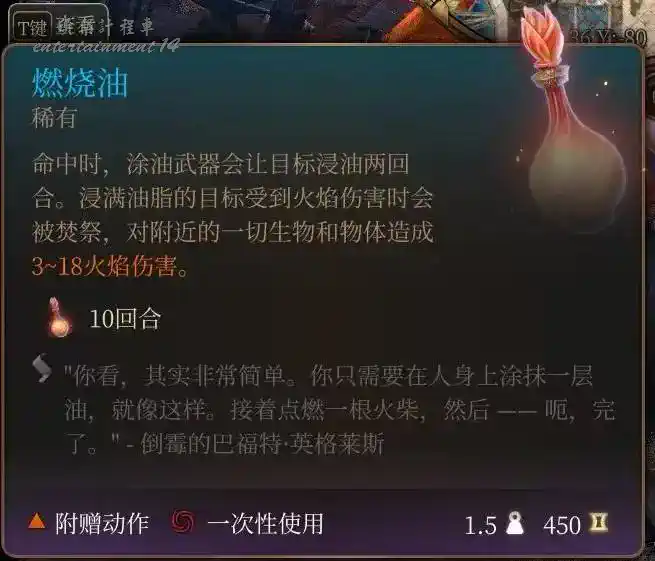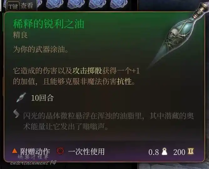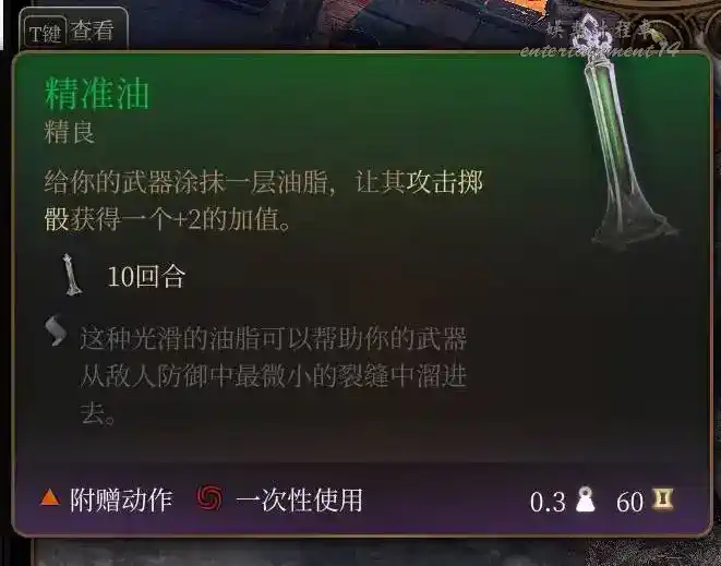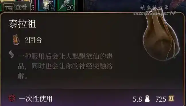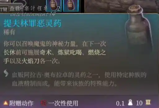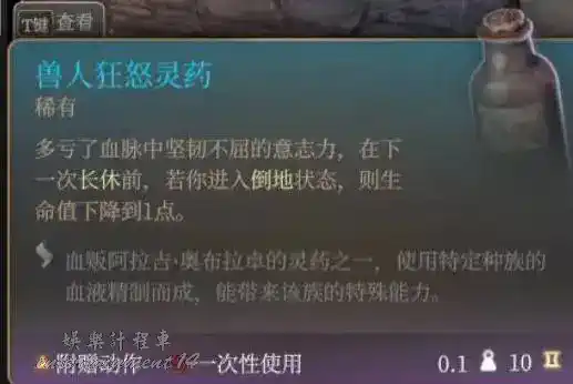 泰拉祖:拉里安特色終章神秘小道具,同速度油,但只有2回合,使用不消耗任何動作,能和速度油疊加,在九指公會的熊地精酒保處購買,數量記得是123的順序來。