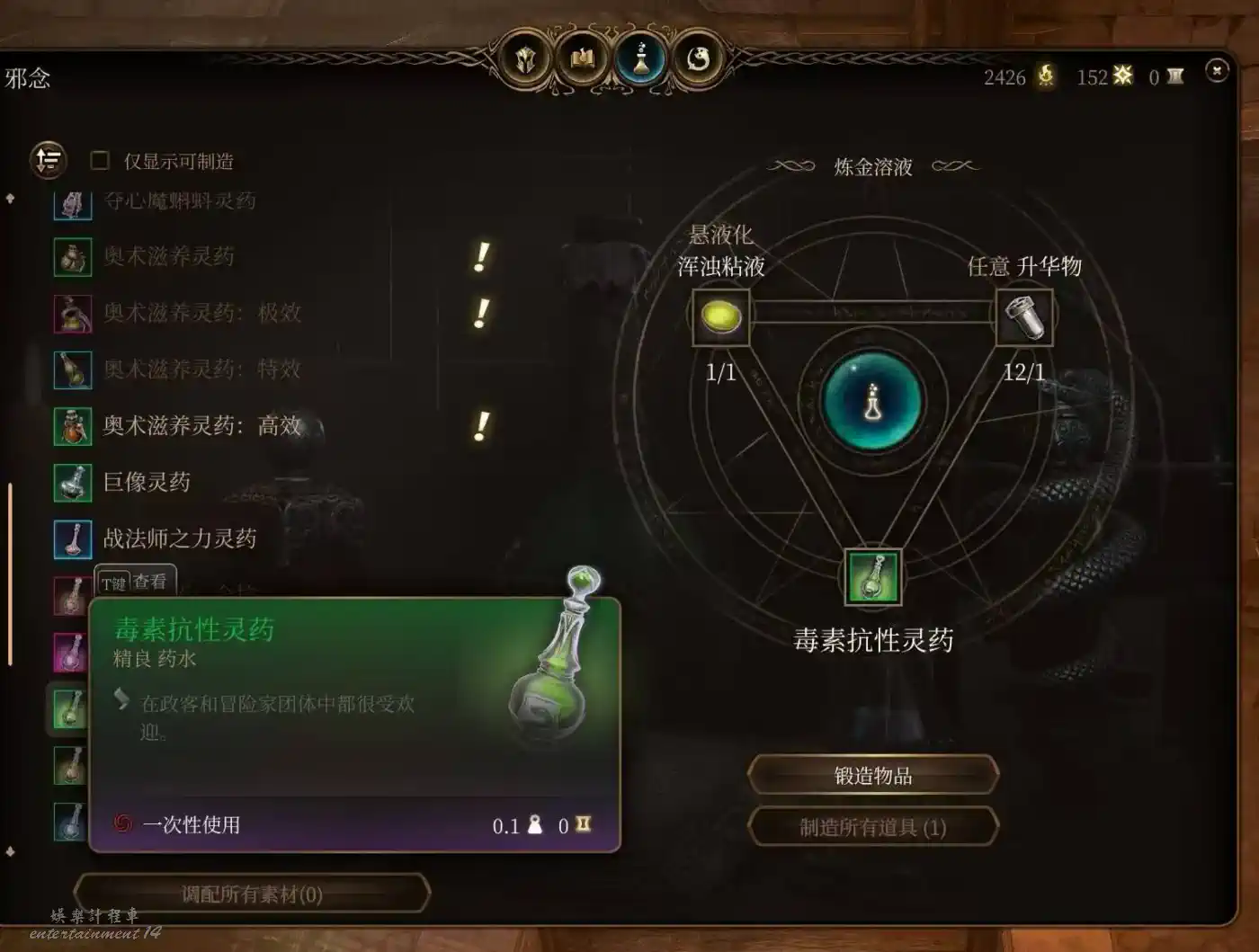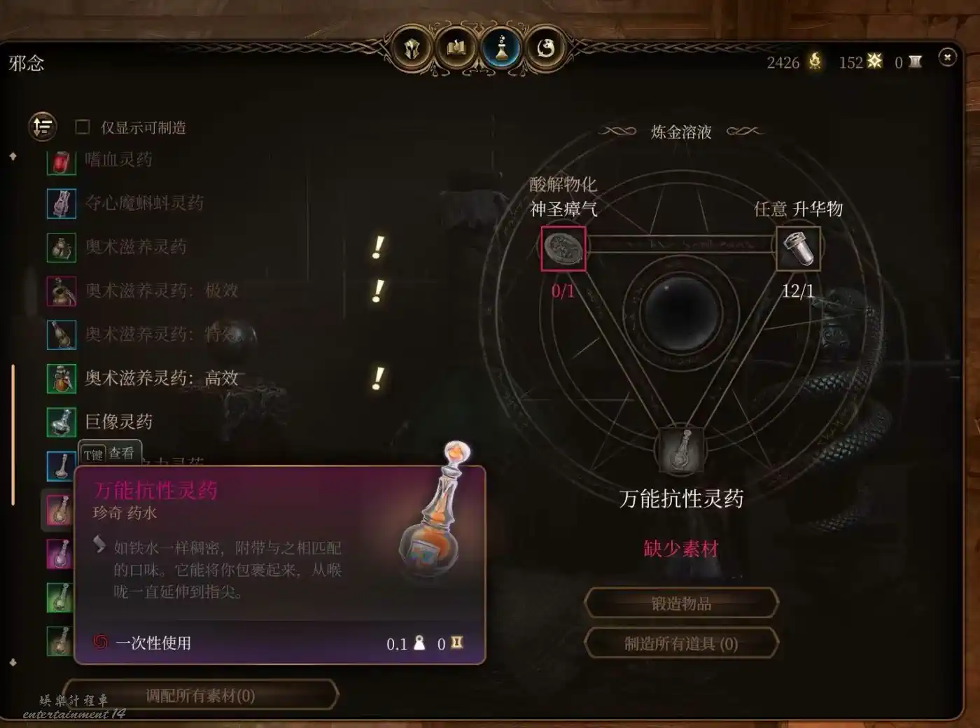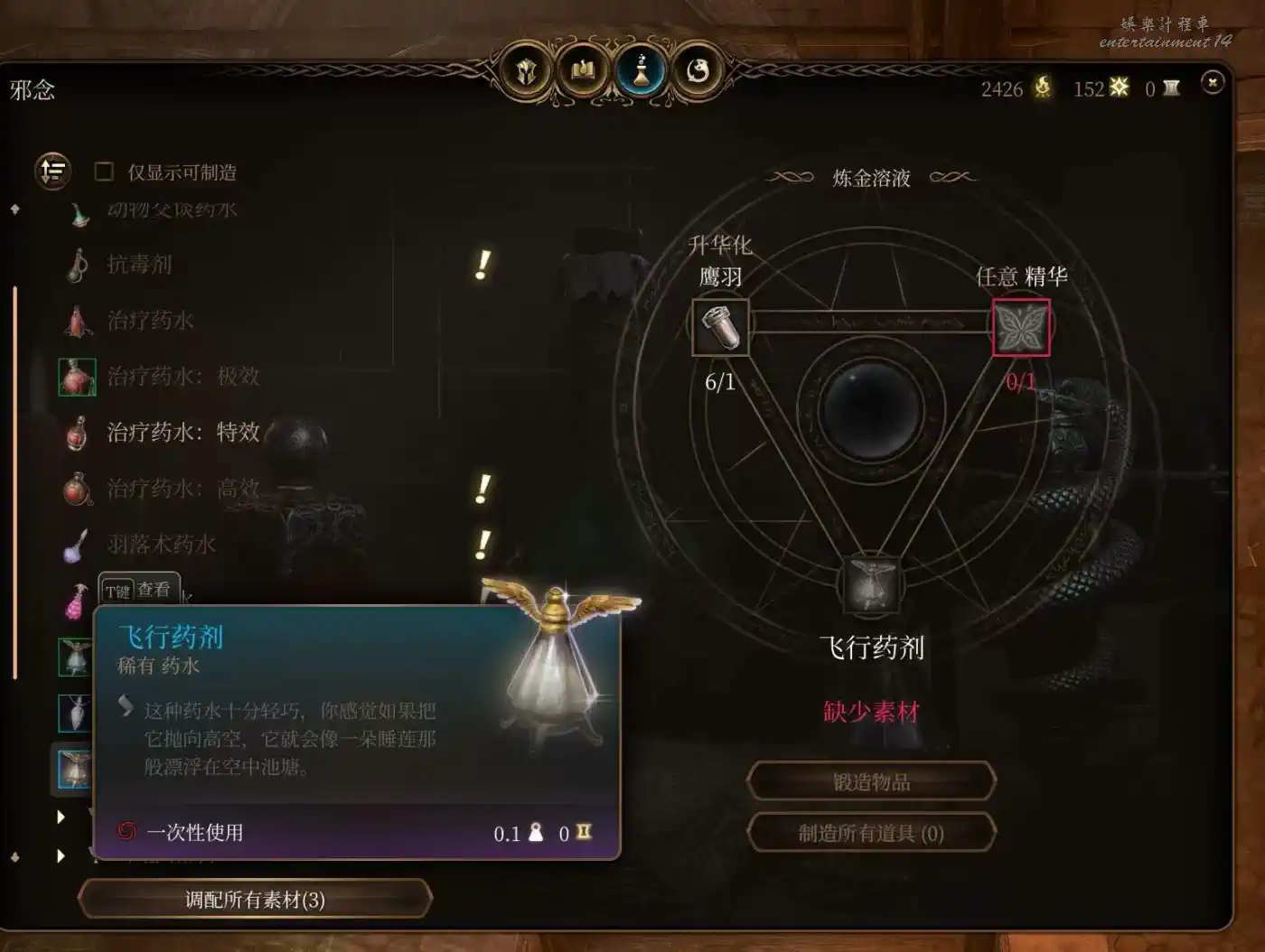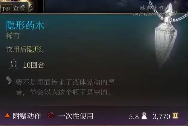 小魔鬼翼膜合成,隱身10回合。隱身的含金量不必多說,極高的戰術上限。隱身脫戰也是下限的保證,榮譽獨狼怕翻車都會備幾瓶。被營地出警了無法脫戰,短暫憎意也可以隱身躲一邊等待發現不了你解除仇恨。當然還是建議玩善線的早點做掉洛若坎把營地這兩尊大神送走,麻煩去別的地方重拳出擊。