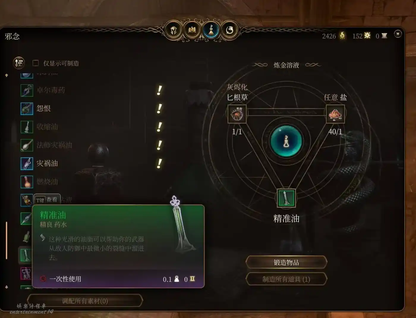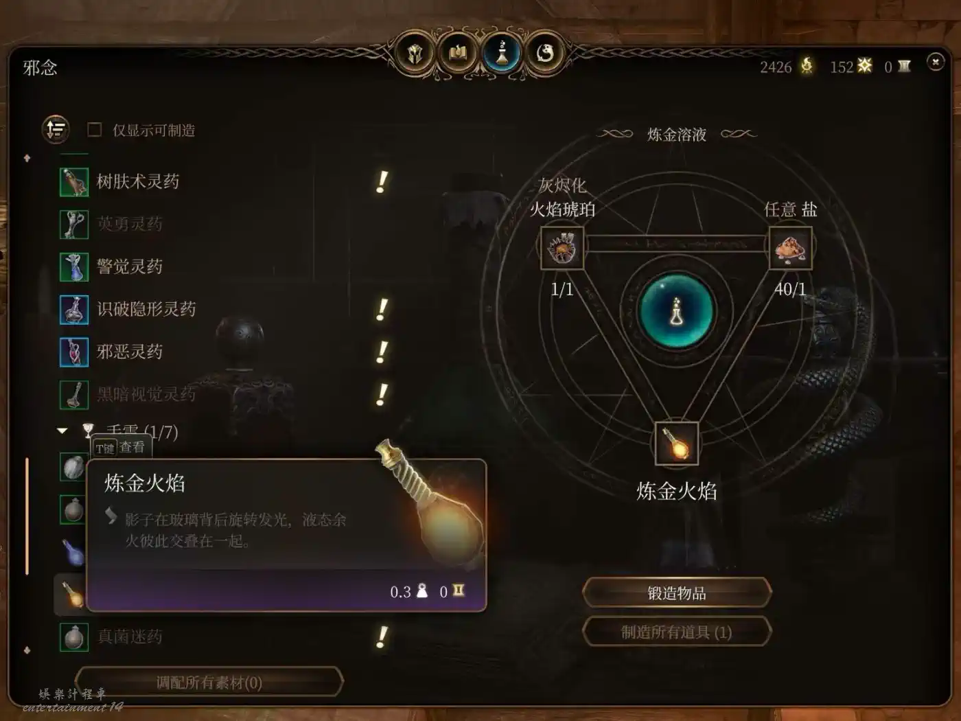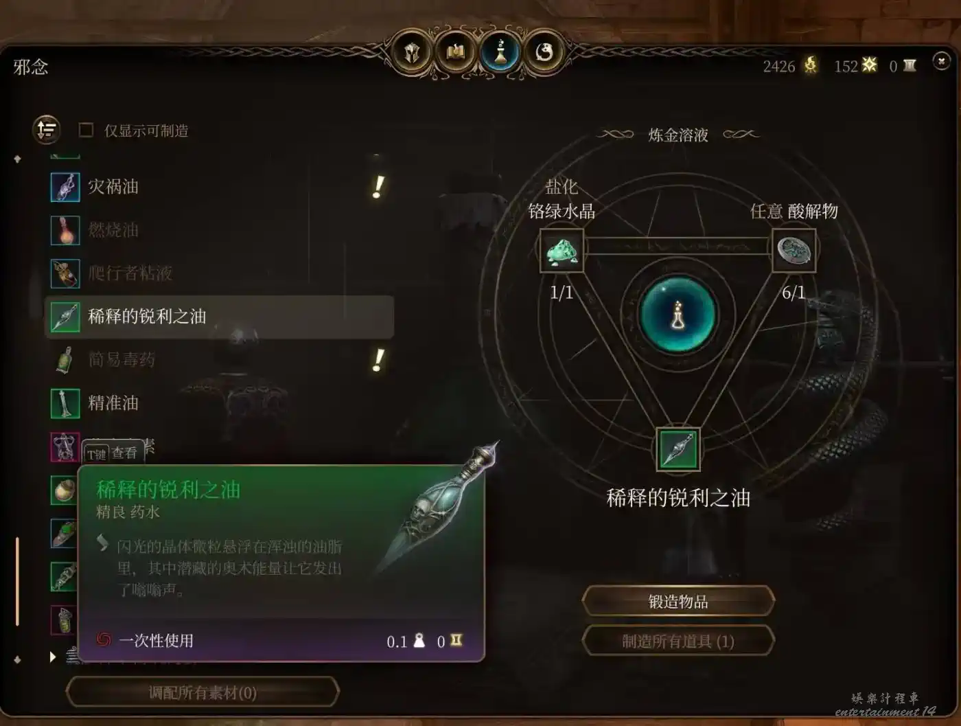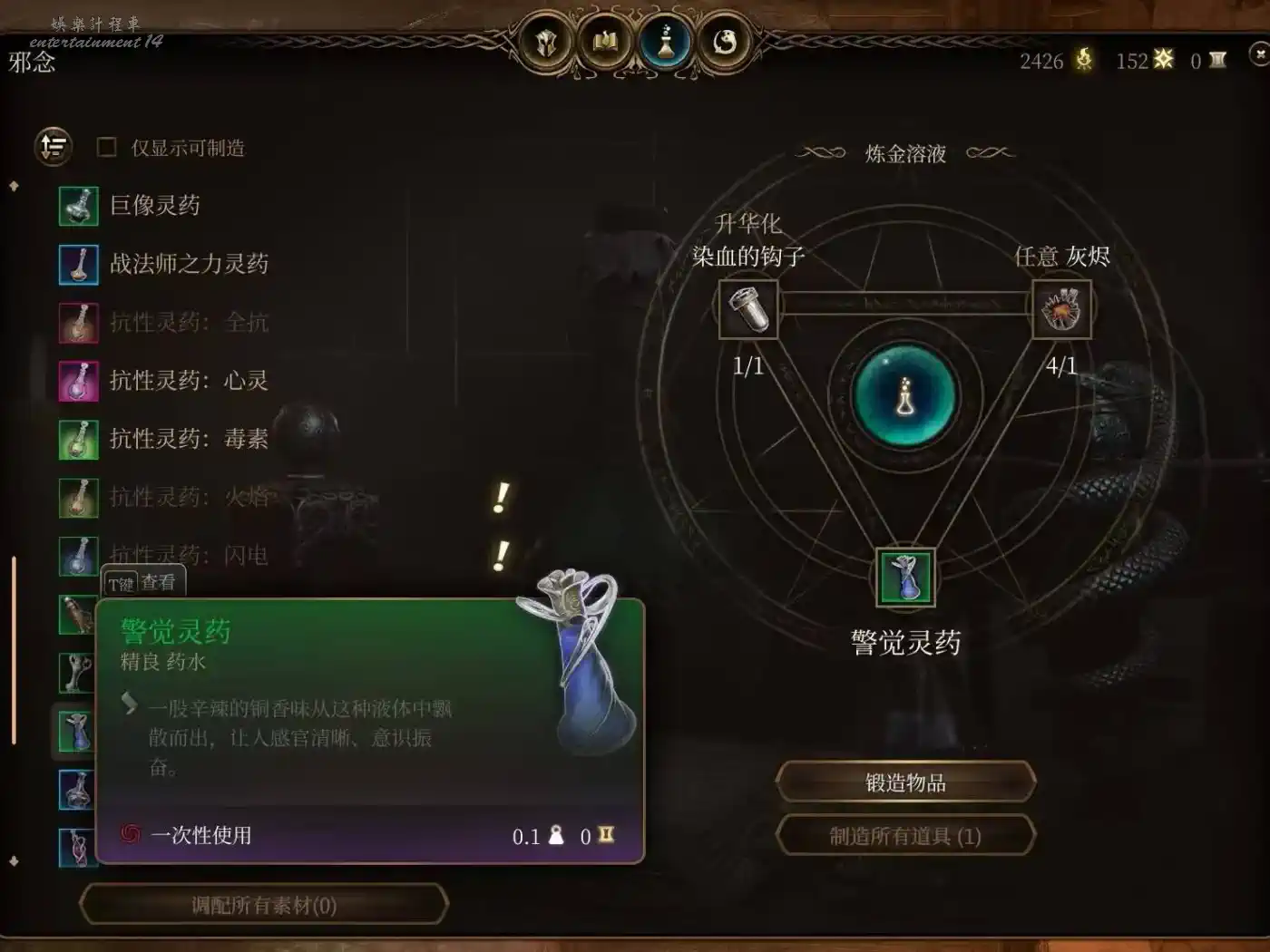 小魔鬼翼膜合成,隱身10回合。隱身的含金量不必多說,極高的戰術上限。隱身脫戰也是下限的保證,榮譽獨狼怕翻車都會備幾瓶。被營地出警了無法脫戰,短暫憎意也可以隱身躲一邊等待發現不了你解除仇恨。當然還是建議玩善線的早點做掉洛若坎把營地這兩尊大神送走,麻煩去別的地方重拳出擊。