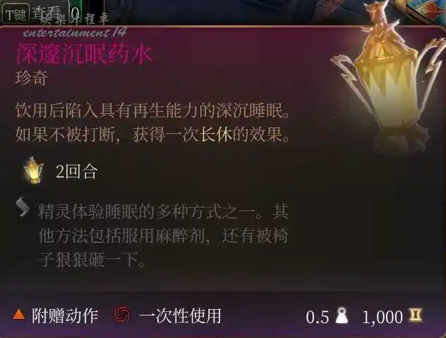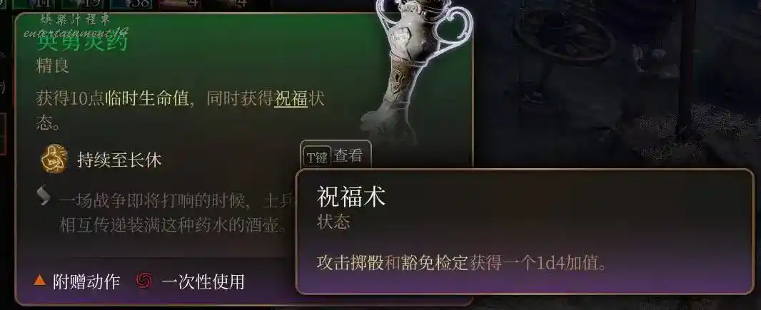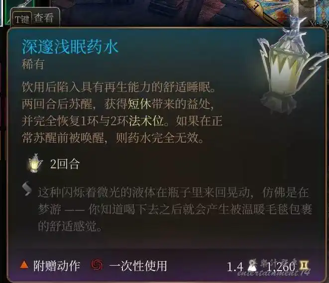+5先攻免疫受驚,需要搶先攻的戰鬥第一章蜘蛛女王,第二章尤格,第三章戈塔什卡紮多爾會使用。攜帶NPC召喚物的戰鬥也可以讓他們喝,提高先攻及早發揮作用。